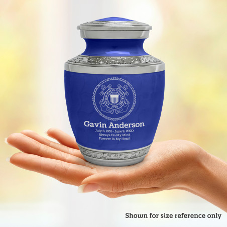 Select Coast Guard Sharing Urn - Royal Blue to create a personal memorial that is a step larger than a keepsake urn but more petite than a full size urn. Bold, attractive colors offer sharp contrast with the engraved text and detailed artwork.