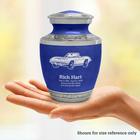 Select Convertible Sharing Urn - Royal Blue to create a personal memorial that is a step larger than a keepsake urn but more petite than a full size urn. Bold, attractive colors offer sharp contrast with the engraved text and detailed artwork.