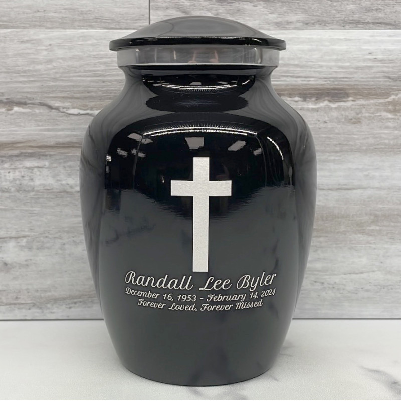Select a Cross Sharing Urn to create a personal memorial that is a step larger than a keepsake urn but more petite than a full size urn. Bold, attractive colors offer sharp contrast with the engraved text and detailed artwork.