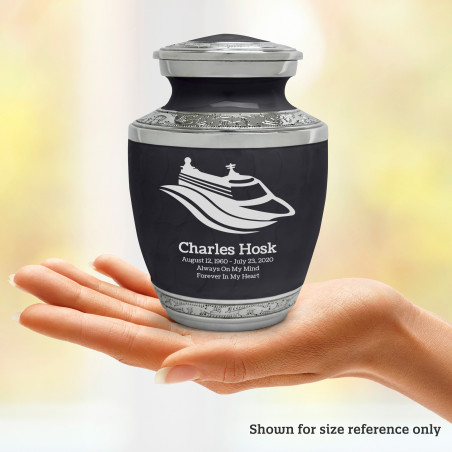 Select Cruise Ship Sharing Urn - Ebony Black to create a personal memorial that is a step larger than a keepsake urn but more petite than a full size urn. Bold, attractive colors offer sharp contrast with the engraved text and detailed artwork.