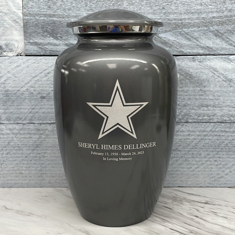The Gunmetal Gray Dallas Star Cremation Urn is engraved with an updated Texas star and serves as a powerful and heartfelt way to memorialize a beloved Texan. The Texas star artwork along with optional engraving that includes a name line, date line and three lines for sentiments allows for the creation of completely custom memorial crafter to stand the test of time.