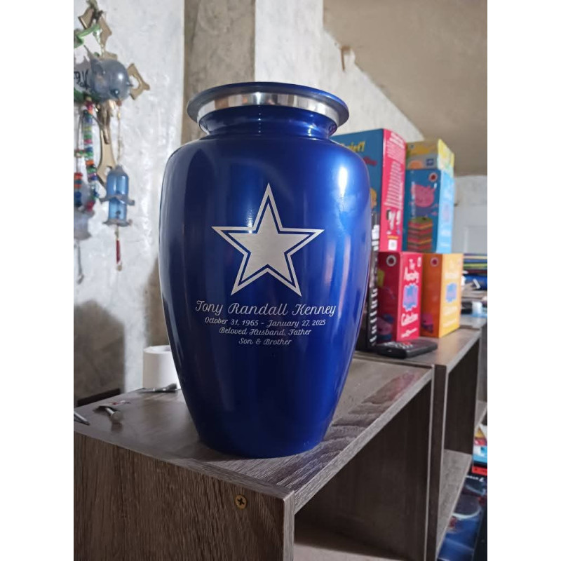 The Midnight Blue Dallas Star Cremation Urn is engraved with an updated Texas Star and serves as a powerful and heartfelt way to memorialize a beloved Texan. The Texas star artwork along with optional engraving that includes a name line, date line and three lines for sentiments allows for the creation of completely custom memorial crafter to stand the test of time.