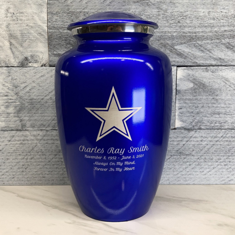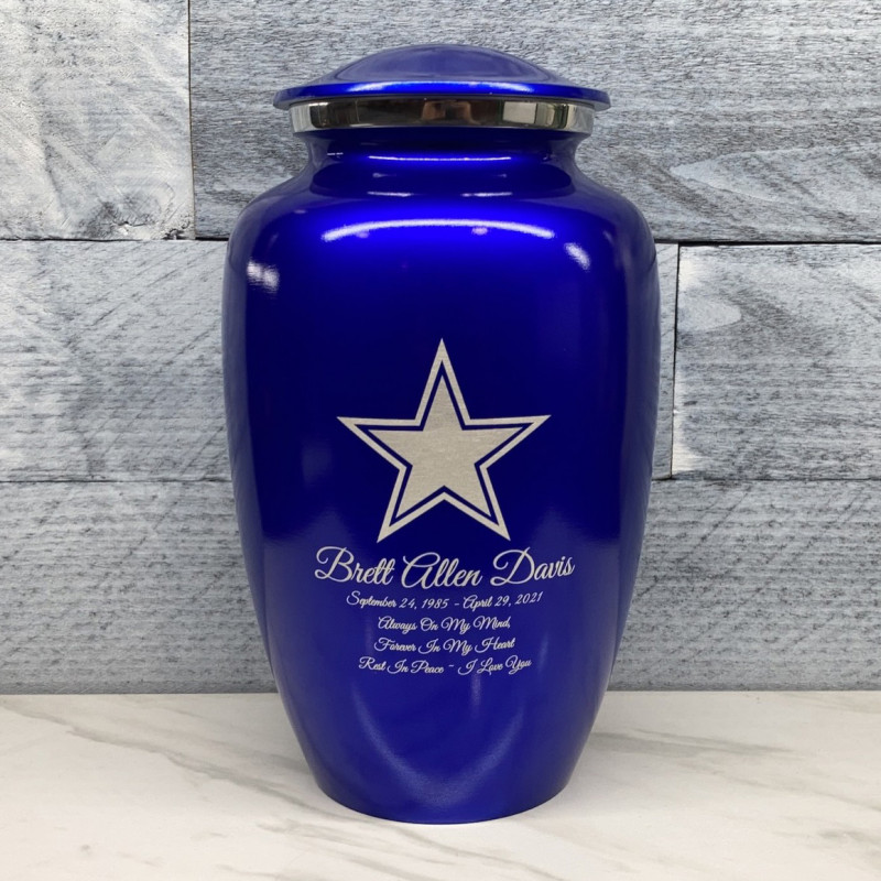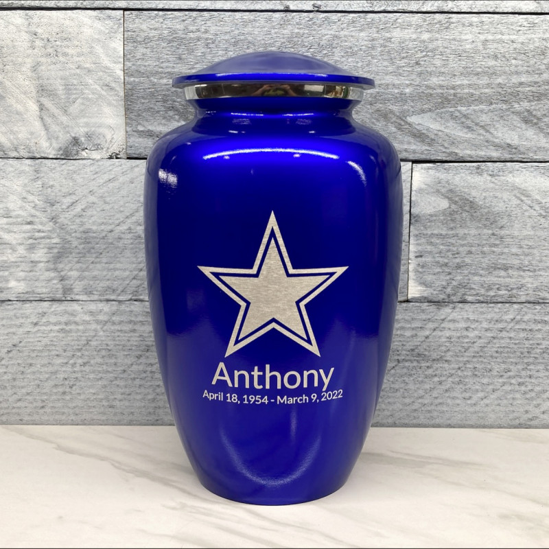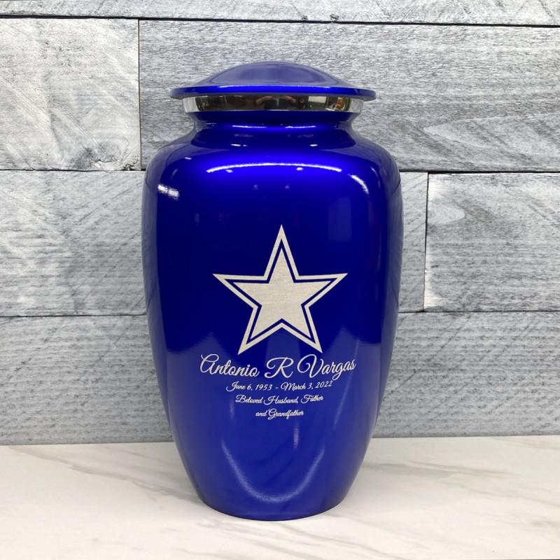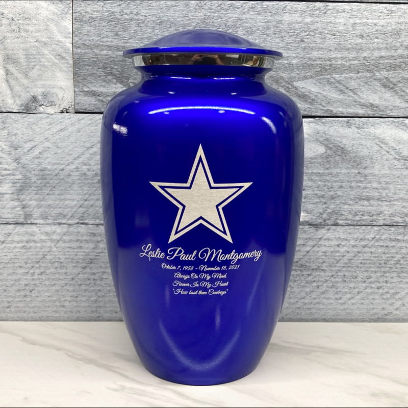 Choose a Dallas Star Cremation Urn to create a beautiful memorial that is sized to hold the entire remains of any adult. Bold, attractive colors offer sharp contrast with the engraved text and detailed artwork.