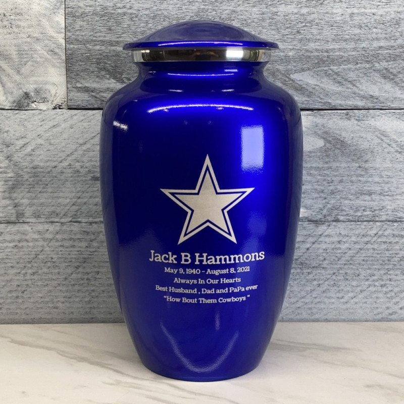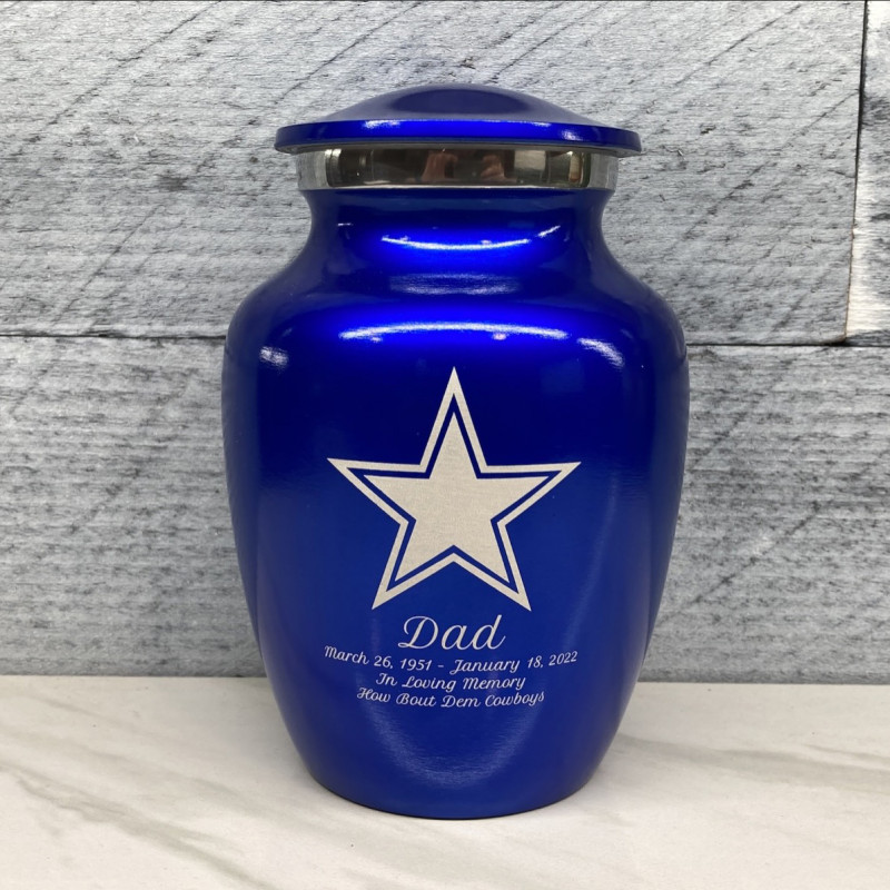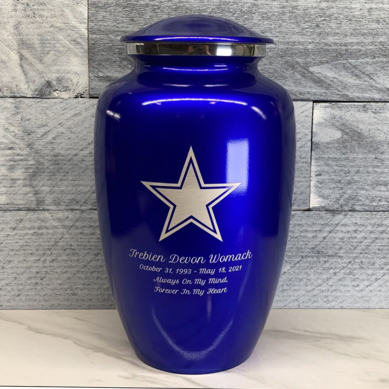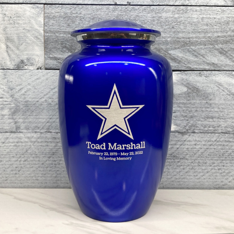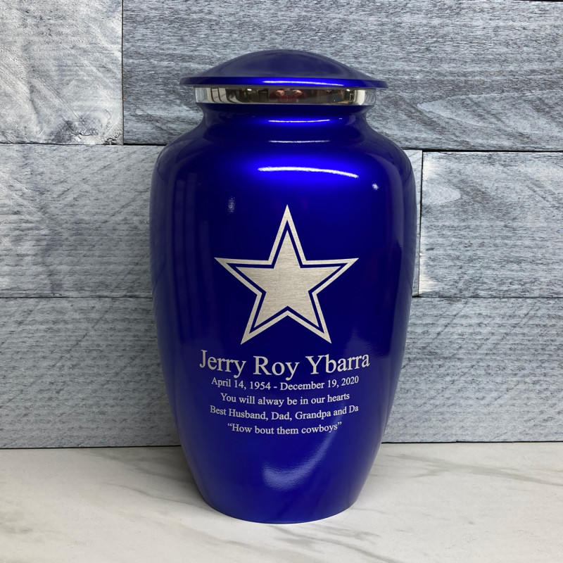 Choose a Dallas Star Cremation Urn to create a beautiful memorial that is sized to hold the entire remains of any adult. Bold, attractive colors offer sharp contrast with the engraved text and detailed artwork.