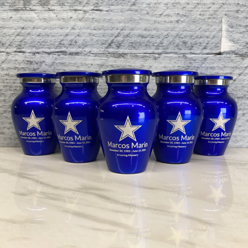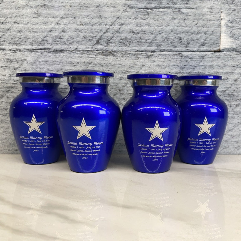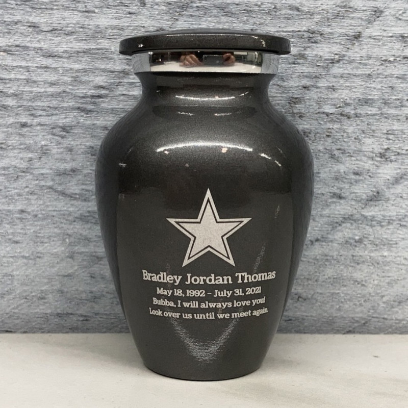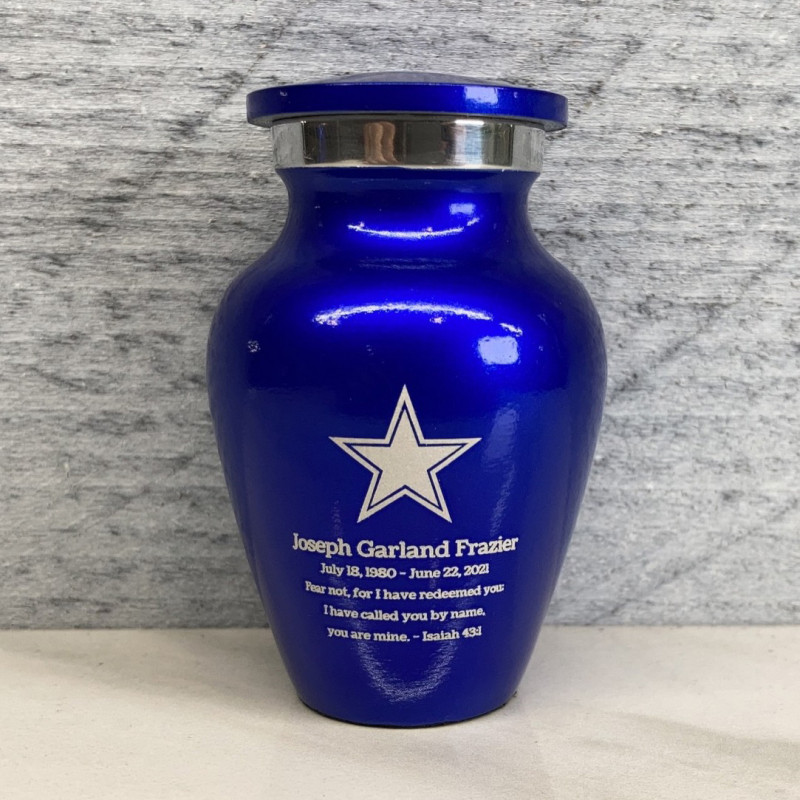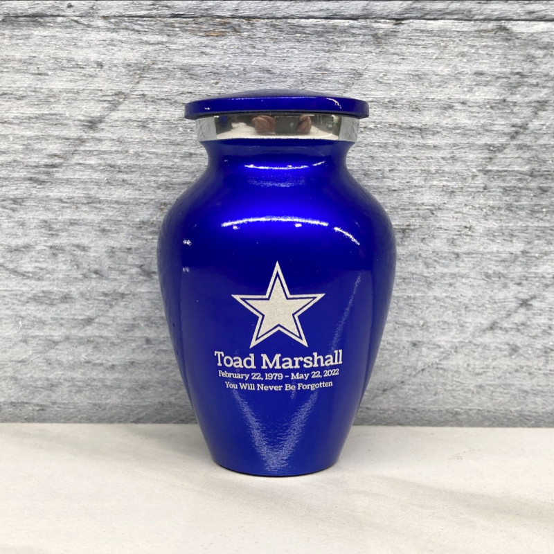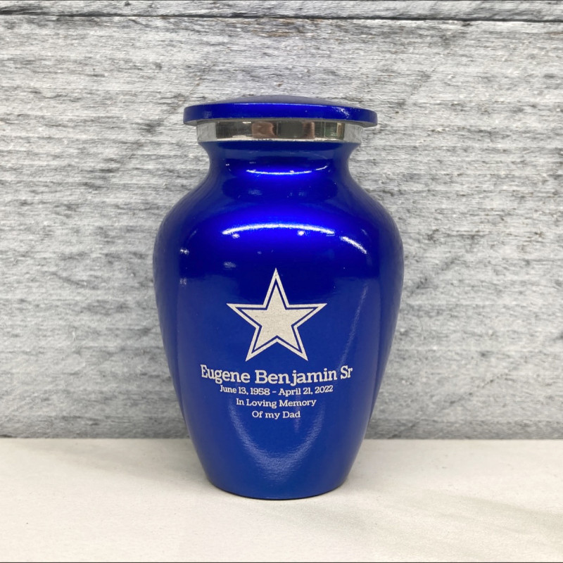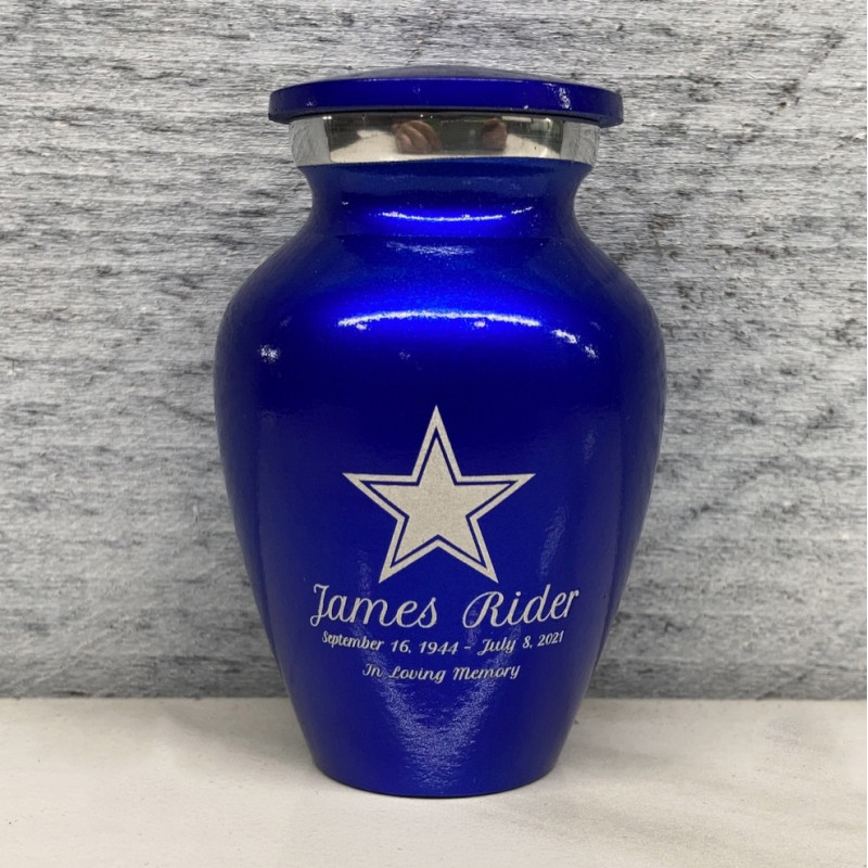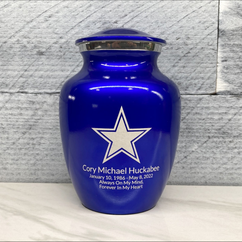 Dallas Star Cremation Urn - Midnight Blue Dallas Star Cremation Urn - Gunmetal Gray Dallas Star Cremation Urn - Purple Luster Dallas Star Cremation Urn - Shamrock Green Dallas Star Cremation Urn - Ruby Red Dallas Star Cremation Urn - Jet BlackDallas Star Cremation Urn - Rose Pink