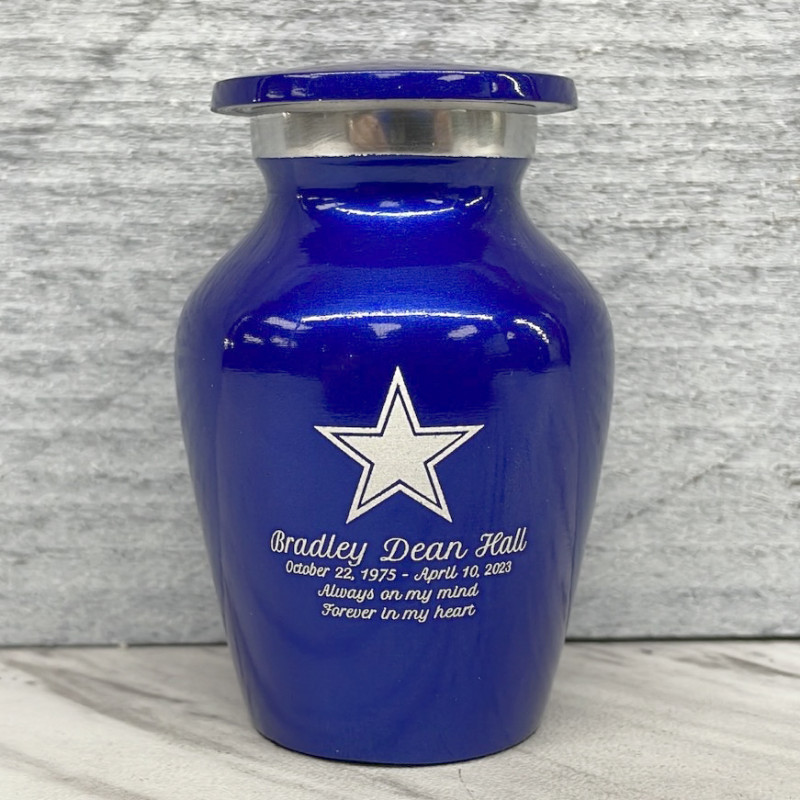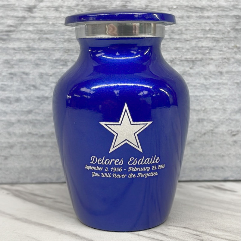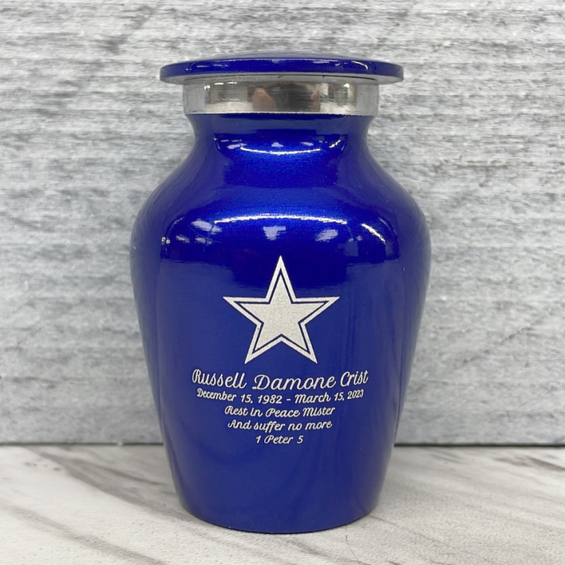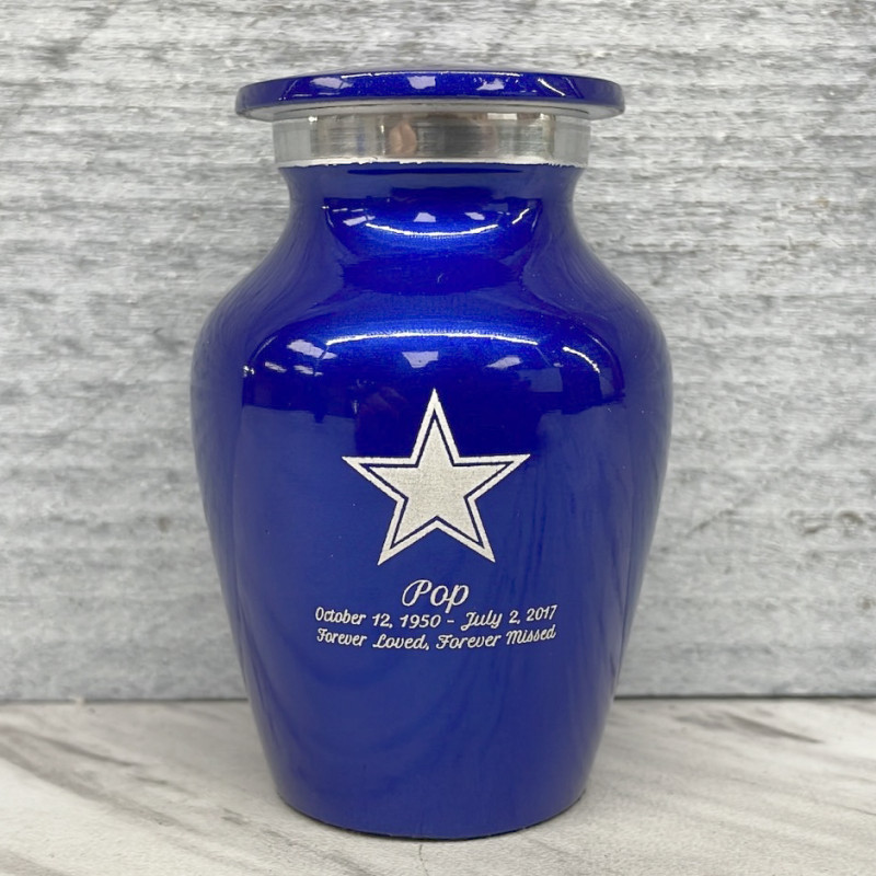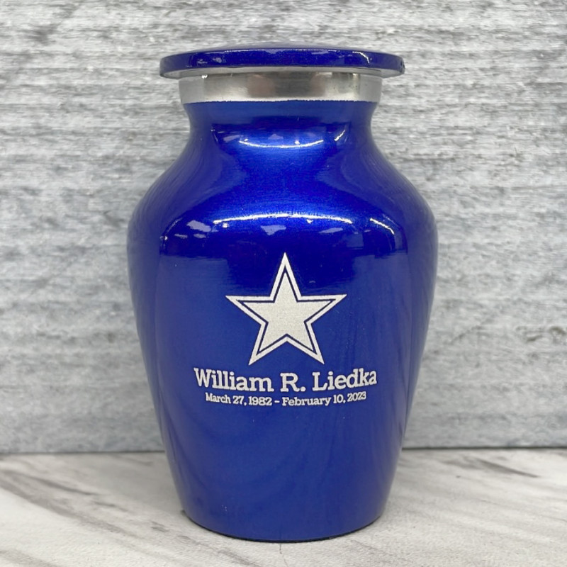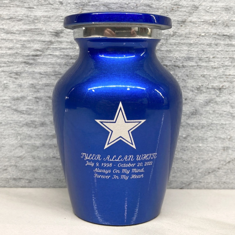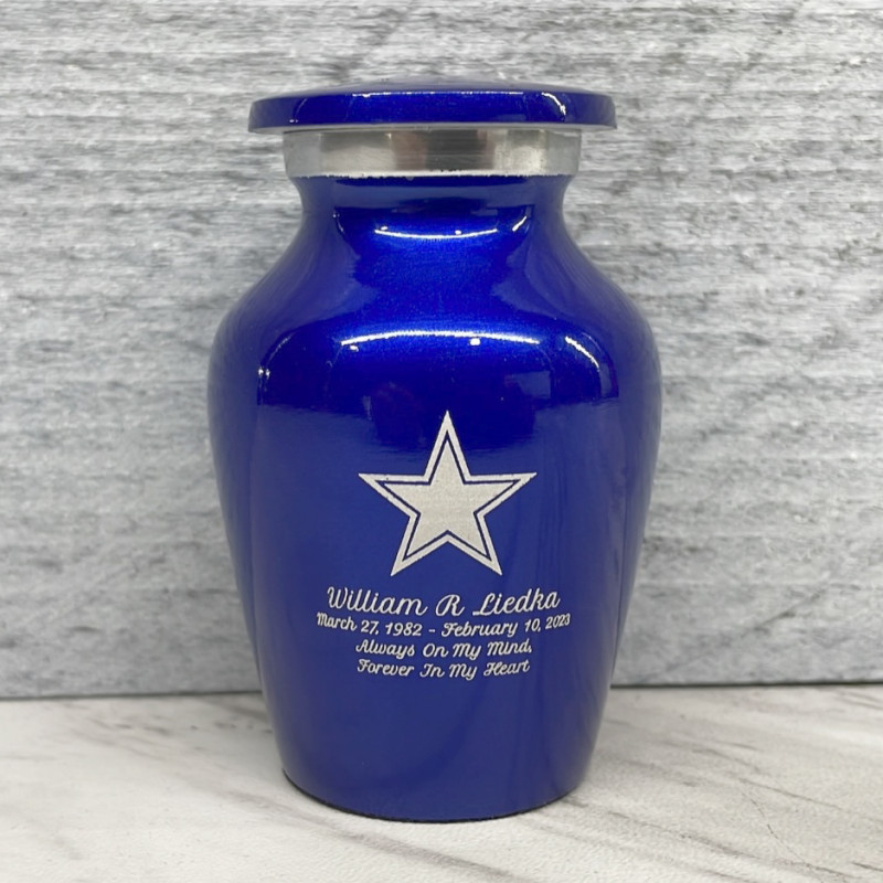 Choose the Midnight Blue Dallas Star Keepsake Cremation Urn to create a handsome personal memorial that illustrates a Texans passion. The brilliant blue color, detailed Dallas Star artwork and optional engraving ensure any family member or close friend can have a memorial to call their own.