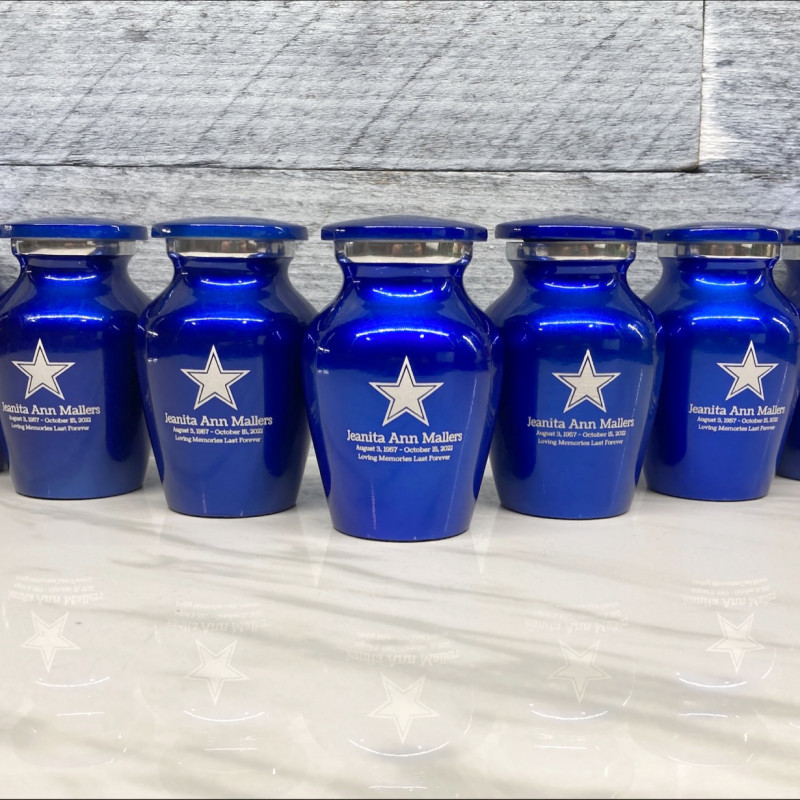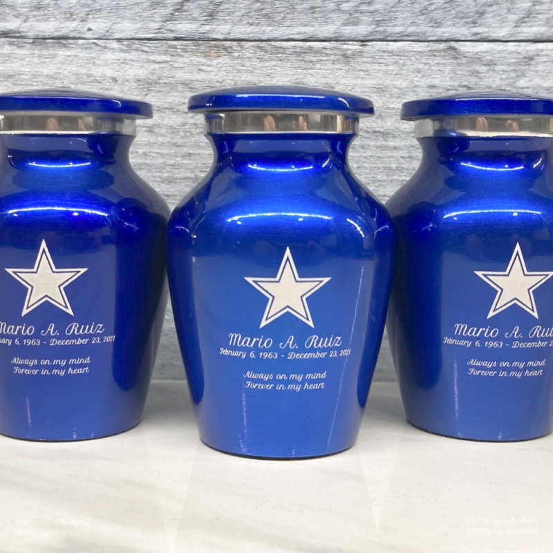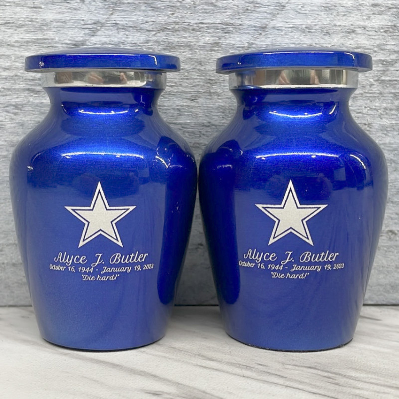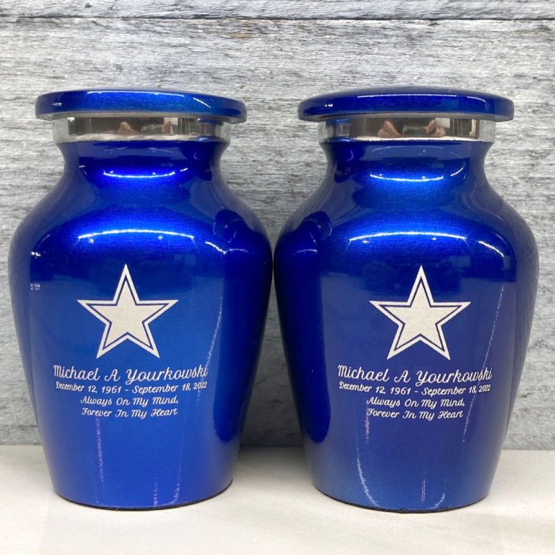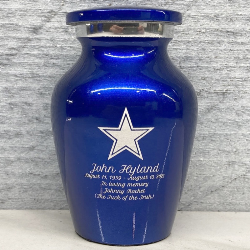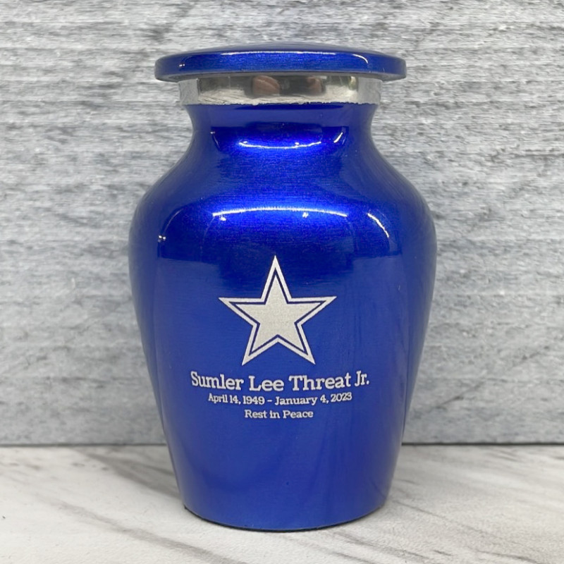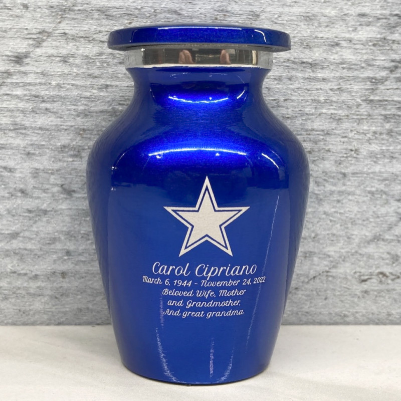 Choose the Midnight Blue Dallas Star Keepsake Cremation Urn to create a handsome personal memorial that illustrates a Texans passion. The brilliant blue color, detailed Dallas Star artwork and optional engraving ensure any family member or close friend can have a memorial to call their own.