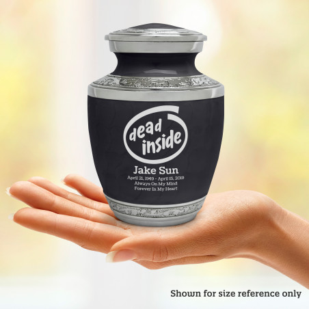 Select Dead Inside Sharing Urn - Ebony Black to create a personal memorial that is a step larger than a keepsake urn but more petite than a full size urn. Bold, attractive colors offer sharp contrast with the engraved text and detailed artwork.