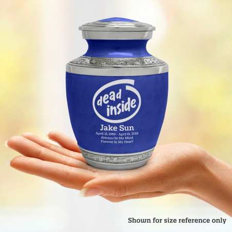 Select Dead Inside Sharing Urn - Royal Blue to create a personal memorial that is a step larger than a keepsake urn but more petite than a full size urn. Bold, attractive colors offer sharp contrast with the engraved text and detailed artwork.