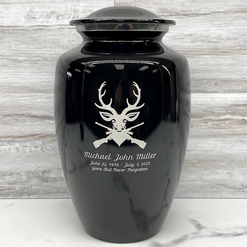 Deer Hunter Cremation Urn - Midnight Blue Deer Hunter Cremation Urn - Gunmetal Gray Deer Hunter Cremation Urn - Purple Luster Deer Hunter Cremation Urn - Shamrock Green Deer Hunter Cremation Urn - Ruby RedDeer Hunter Cremation Urn - Jet Black