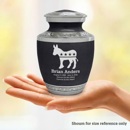 Select Democratic Donkey Sharing Urn - Ebony Black to create a personal memorial that is a step larger than a keepsake urn but more petite than a full size urn. Bold, attractive colors offer sharp contrast with the engraved text and detailed artwork.
