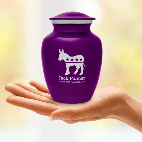 The Purple Luster Democratic Donkey Sharing Cremation Urn memorializes your loved one with a classic icon of the Democratic Party. An outstanding value that allows everyone in the family to have a memorial of their own, optional engraving front and back there are many ways to make the urn unique to your loved one. A threaded lid and felt base ensure it securely closes and protects display surfaces.