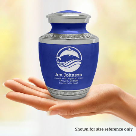Select Dolphin Sharing Urn - Royal Blue to create a personal memorial that is a step larger than a keepsake urn but more petite than a full size urn. Bold, attractive colors offer sharp contrast with the engraved text and detailed artwork.