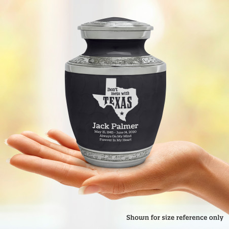 Select Don't Mess with Texas Sharing Urn - Ebony Black to create a personal memorial that is a step larger than a keepsake urn but more petite than a full size urn. Bold, attractive colors offer sharp contrast with the engraved text and detailed artwork.