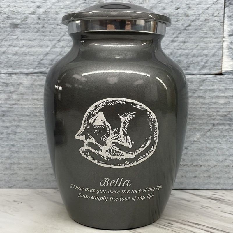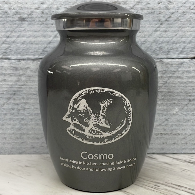 The Small Gunmetal Gray Dreaming Cat Pet Cremation Urn is an attractive and meaningful way to pay tribute to your pet who has passed on. Optional engraving features a name line and two additional lines that can include dates or sentiment lines. Choose from our most popular sentiments, customize them or enter your own text to make it completely unique.