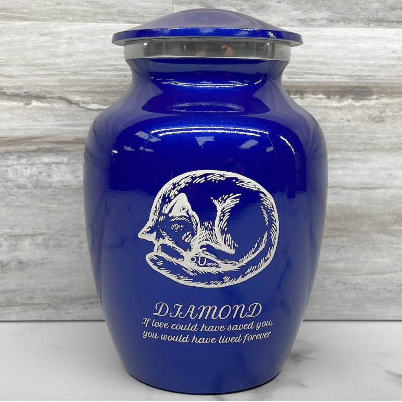 The Small Midnight Blue Dreaming Kitten Cremation Urn is an attractive and meaningful way to pay tribute to your pet who has passed on. Optional engraving features a name line and two additional lines that can include dates or sentiment lines. Choose from our most popular sentiments, customize them or enter your own text to make it completely unique.