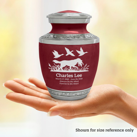 Select Duck Hunting Dog Sharing Urn - Rose Red to create a personal memorial that is a step larger than a keepsake urn but more petite than a full size urn. Bold, attractive colors offer sharp contrast with the engraved text and detailed artwork.