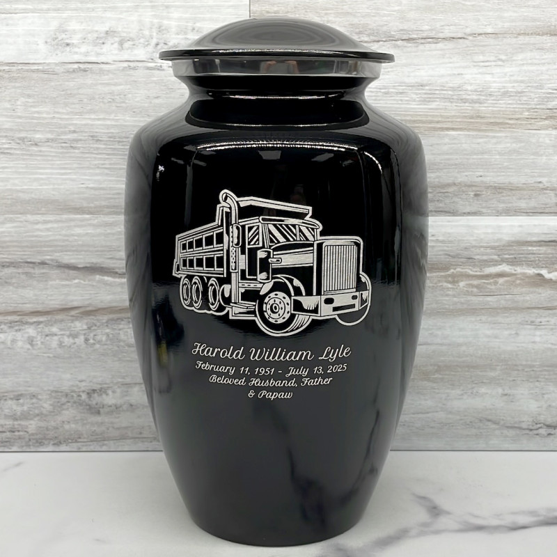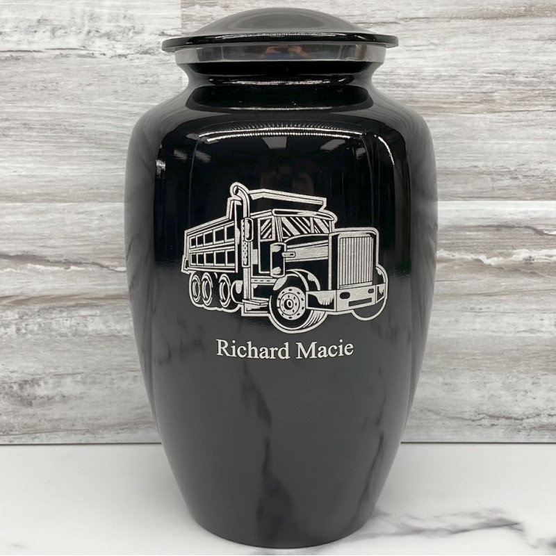 Choose a Dumping Truck Cremation Urn to create a beautiful memorial that is sized to hold the entire remains of any adult. Bold, attractive colors offer sharp contrast with the engraved text and detailed artwork.