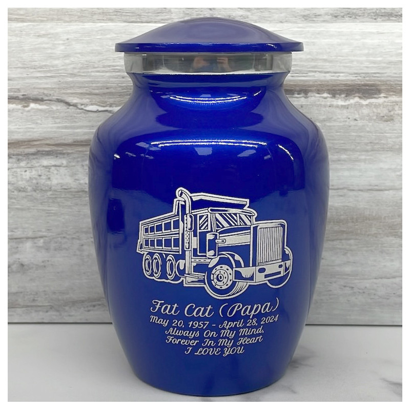 Select a Dumping Truck Sharing Urn to create a personal memorial that is a step larger than a keepsake urn but more petite than a full size urn. Bold, attractive colors offer sharp contrast with the engraved text and detailed artwork.