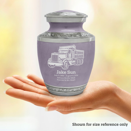 Select Dumptruck II Sharing Urn - Regal Purple to create a personal memorial that is a step larger than a keepsake urn but more petite than a full size urn. Bold, attractive colors offer sharp contrast with the engraved text and detailed artwork.