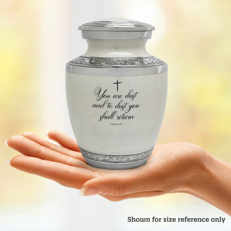 Select Dust to Dust Sharing Urn - Radiant White to create a personal memorial that is a step larger than a keepsake urn but more petite than a full size urn. Bold, attractive colors offer sharp contrast with the engraved text and detailed artwork.