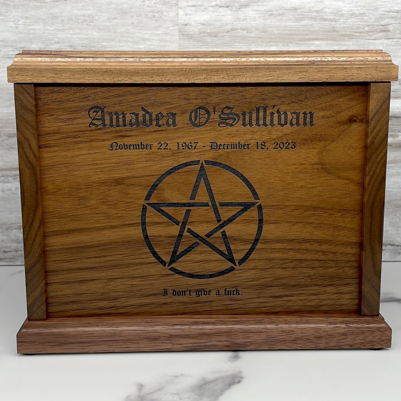 This made in the USA solid walnut Eagle urn is custom built for Green Meadow Memorials to meet our demanding specifications for a beautiful, high quality hardwood urn. The solid walnut has an attractive natural color that is timeless and works well with our direct laser engraving process.