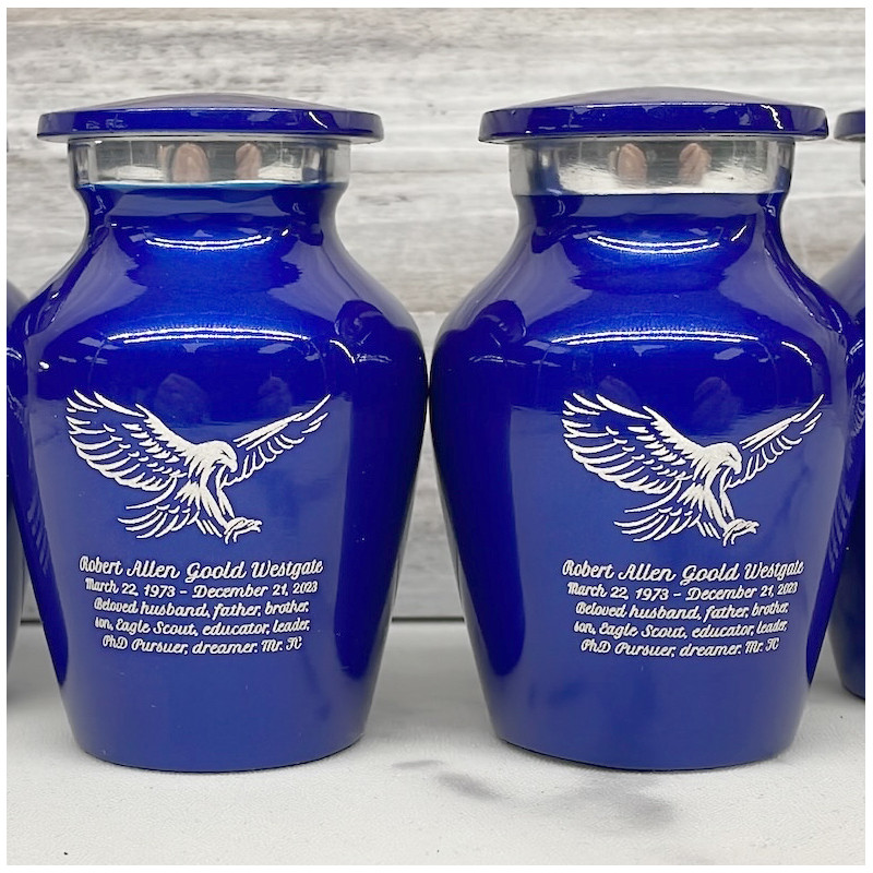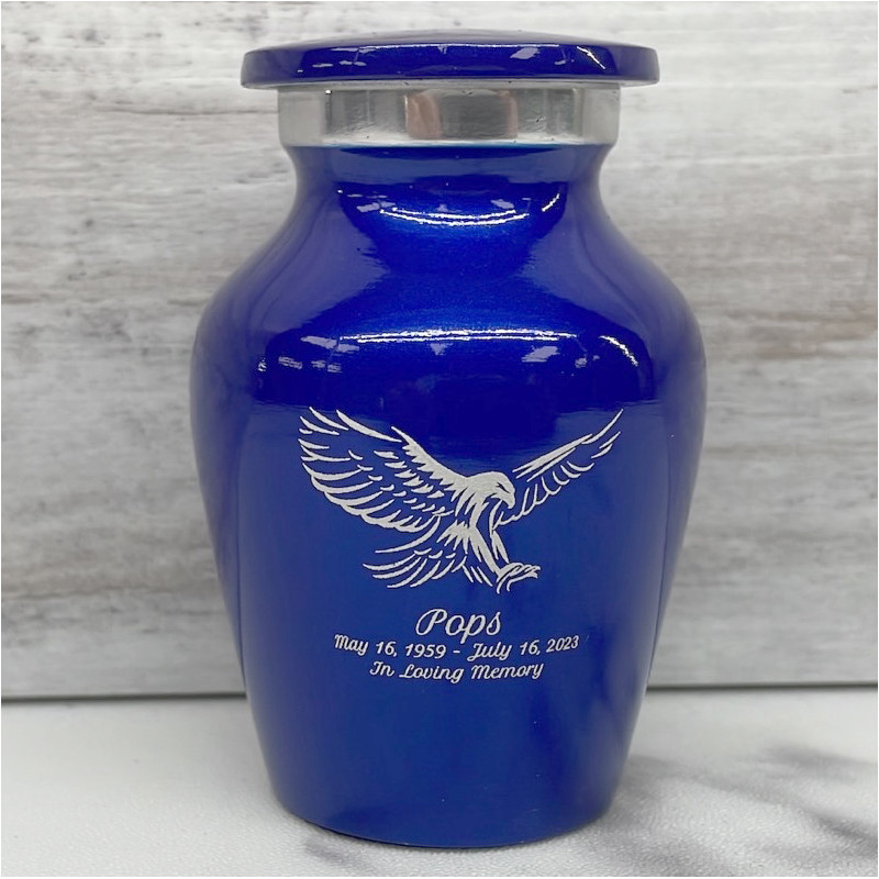 Choose the Midnight Blue Eagle Keepsake Cremation Urn to create a handsome personal memorial of featuring a symbol of freedom and independence. The brilliant blue color, detailed eagle artwork and optional engraving ensure any family member or close friend can have a memorial to call their own.