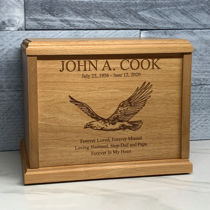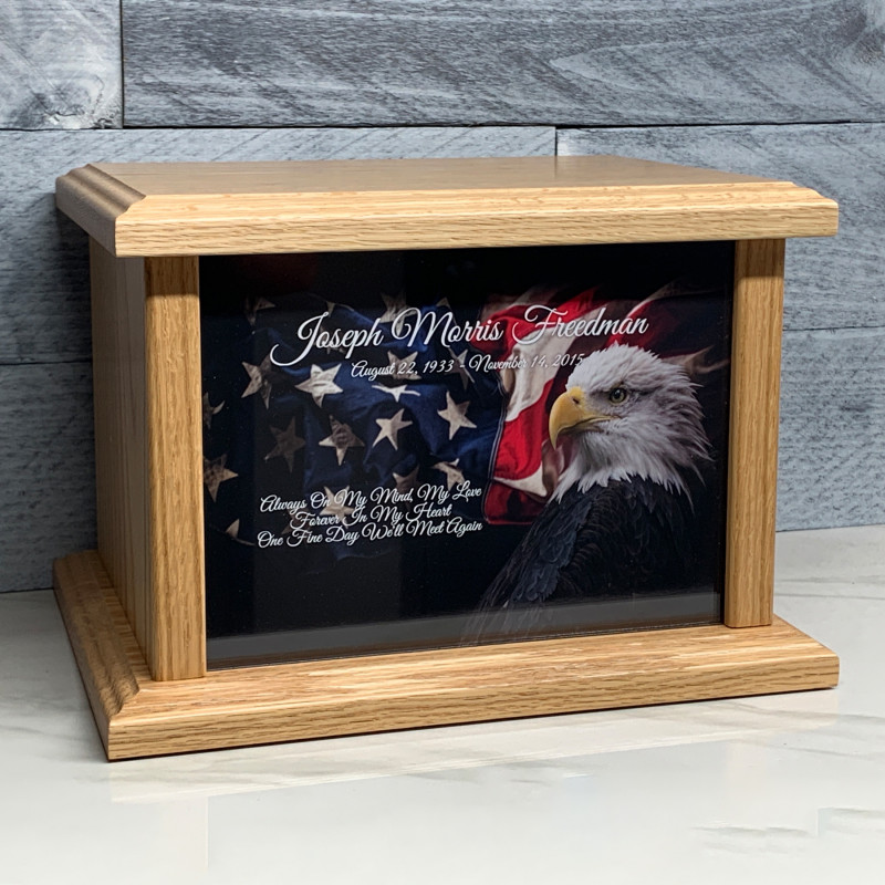 The Ruby Red Eagle Keepsake Cremation Urn is a handsome personal memorial that features a powerful eagle and optional additional engraving. The Ruby Red color combined with attractive eagle artwork, along with optional custom engraving creates an unique keepsake for family members and close friends that can be treasured for years to come.