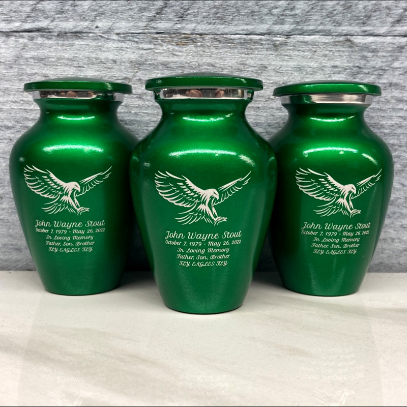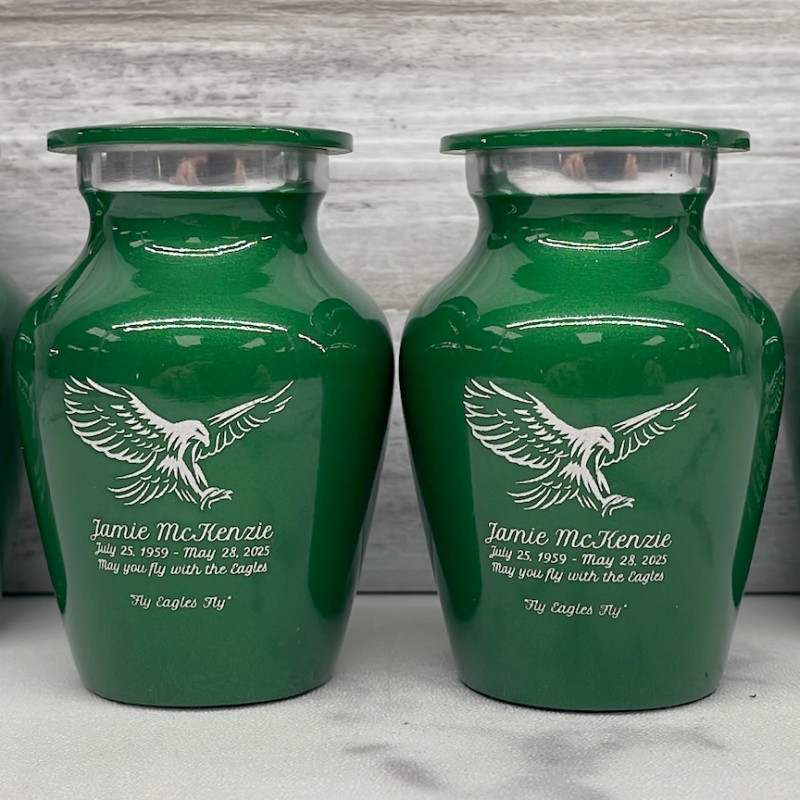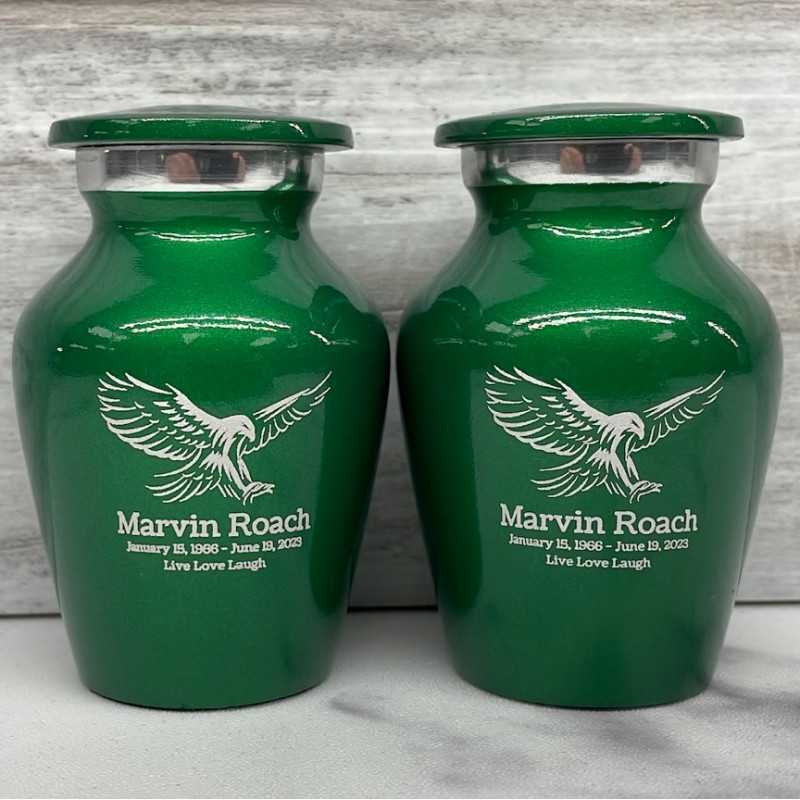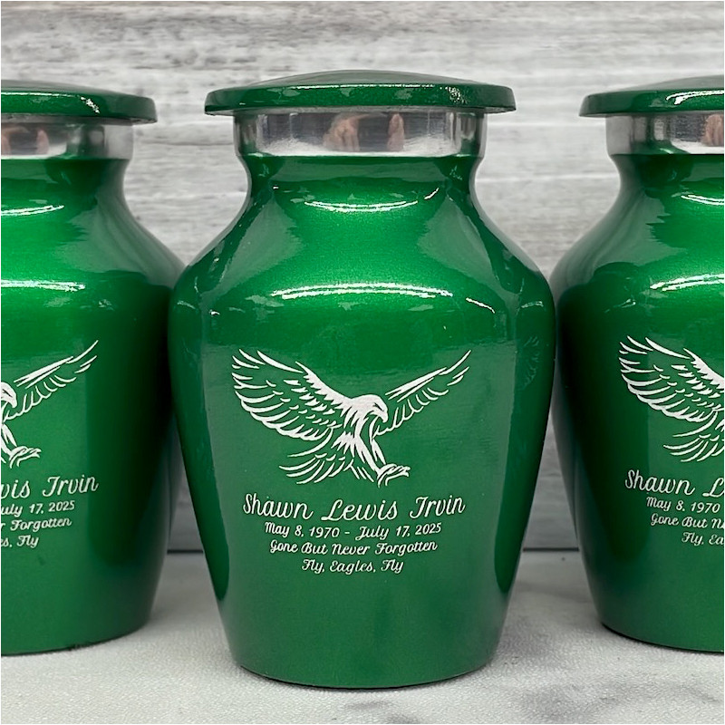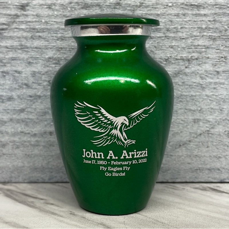 The Shamrock Eagle Keepsake Cremation Urn keeps the memory of your loved one close and memorializes them with a detailed eagle engraving. This powerful engraved eagle artwork along with optional engraving that includes a name line, date line and three lines for sentiments allows for the creation of completely custom personal memorials.