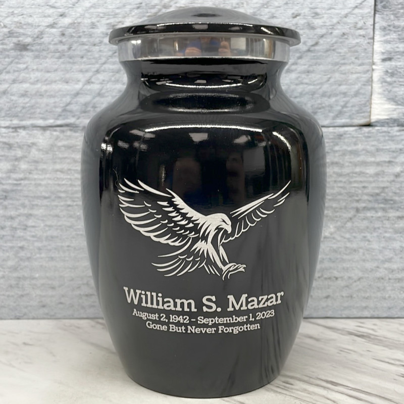 Select an Eagle Sharing Urn to create a personal memorial that is a step larger than a keepsake urn but more petite than a full size urn. Bold, attractive colors offer sharp contrast with the engraved text and detailed artwork.