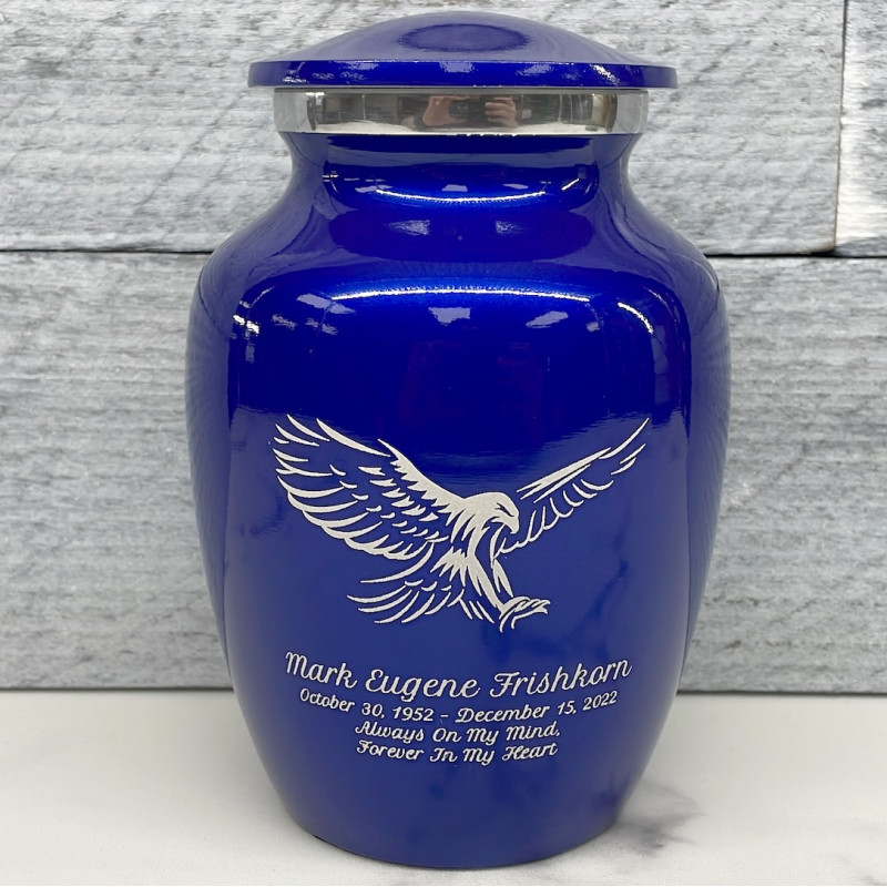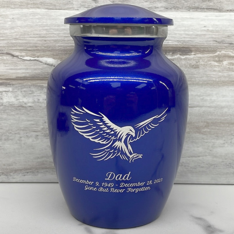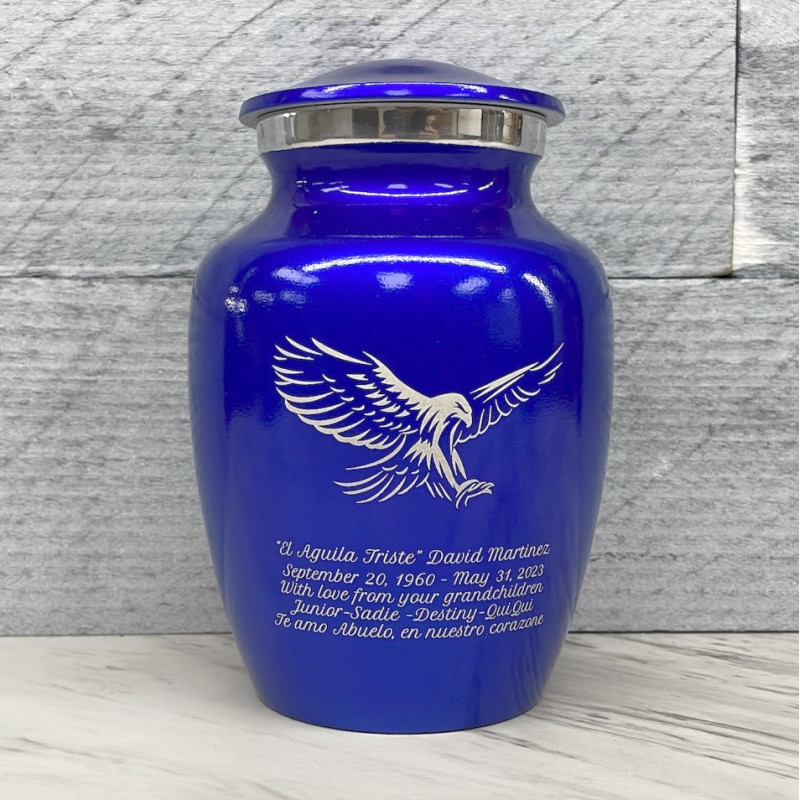 The Midnight Blue Eagle Sharing Cremation Urn memorializes your loved one with a detailed, strong eagle engraving. An outstanding value that allows everyone in the family to have a memorial of their own, optional engraving front and back there are many ways to make the urn unique to your loved one. A threaded lid and felt base ensure it securely closes and protects display surfaces.