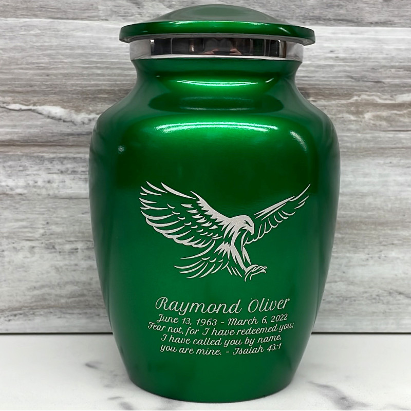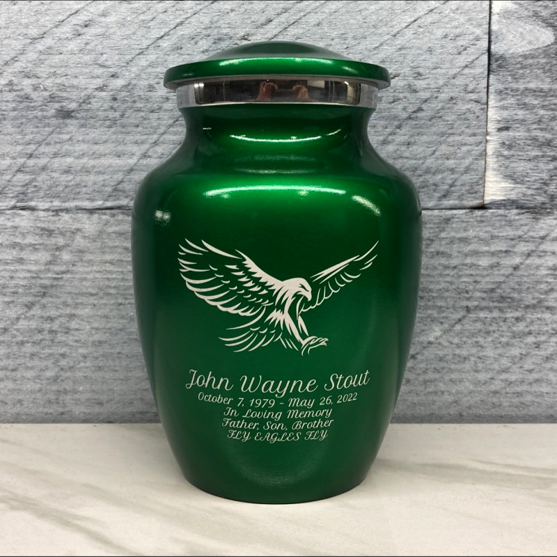 The Shamrock Green Eagle Sharing Cremation Urn memorializes your loved one with a detailed, strong eagle engraving. An outstanding value that allows everyone in the family to have a memorial of their own, optional engraving front and back there are many ways to make the urn unique to your loved one. A threaded lid and felt base ensure it securely closes and protects display surfaces.