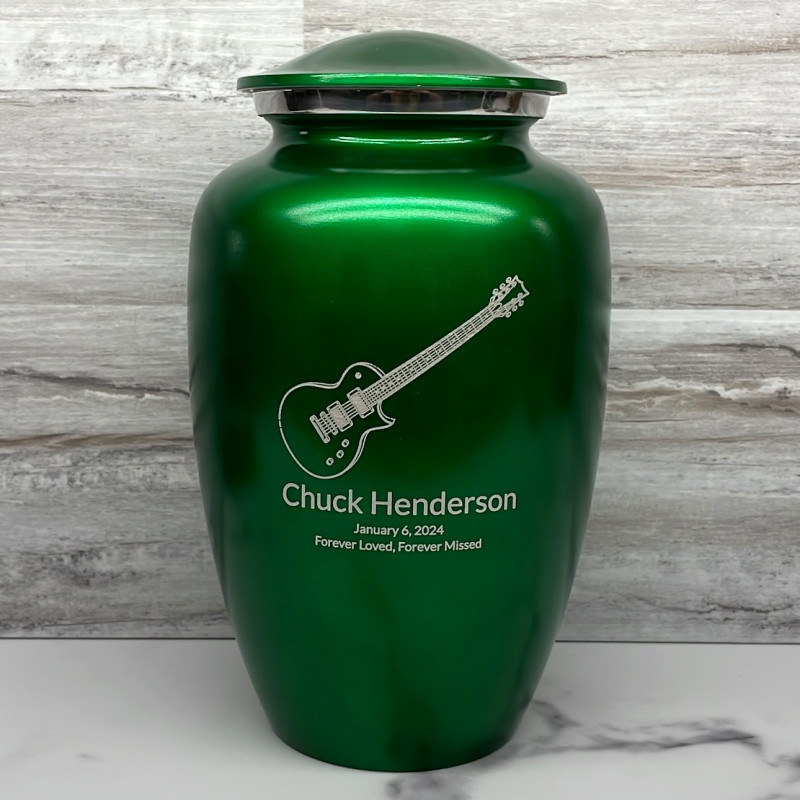 The Shamrock Green Electric Guitar Cremation Urn is an attractive and fitting memorial for the departed loved one who had a passion for music and rocking out. The detailed artwork can be combined with optional engraving on the front and back of the urn. Engraving suggestions are available via drop down menus or custom text can be entered to ensure that the custom urn that is created is a treasured memorial for your loved one.