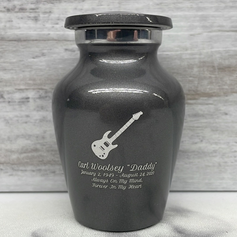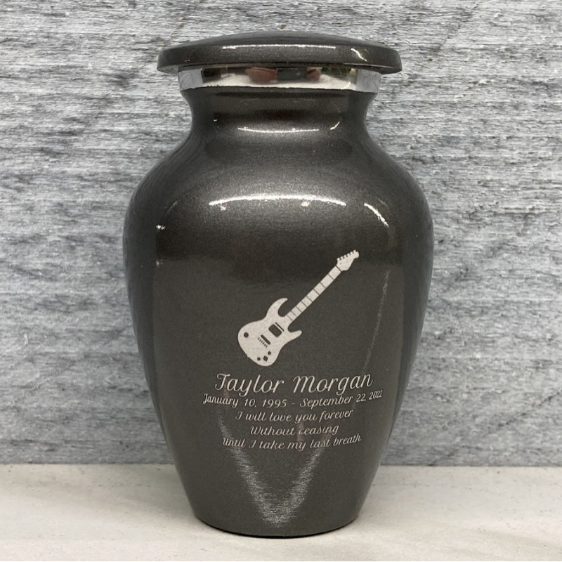 Choose the Gunmetal Electric Guitar Keepsake Cremation Urn to celebrate your loved one with a personal memorial engraved with detailed electric guitar. Customize the urn with special engraving for each family member or close friend, creating memorials for each to hold close.