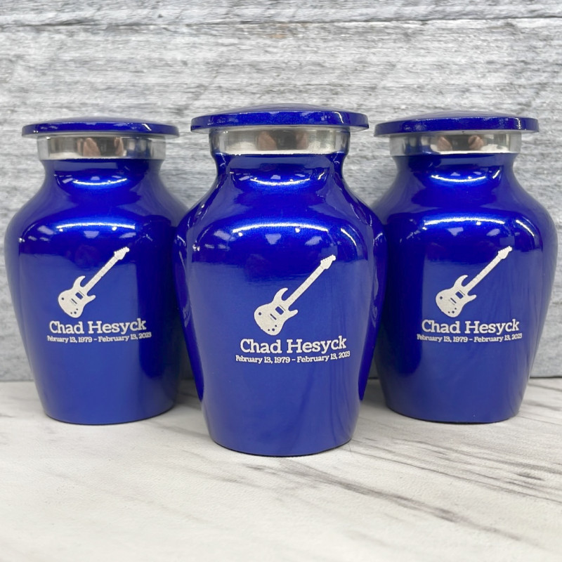 Choose the Midnight Blue Electric Guitar Keepsake Cremation Urn to create a handsome personal memorial rocking an electric guitar engraving. The brilliant blue color, detailed electric guitar artwork and optional engraving ensure any family member or close friend can have a memorial to call their own.