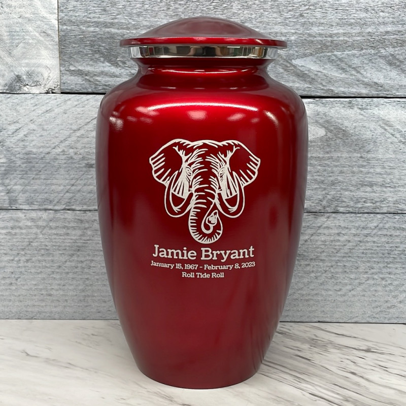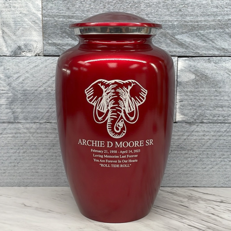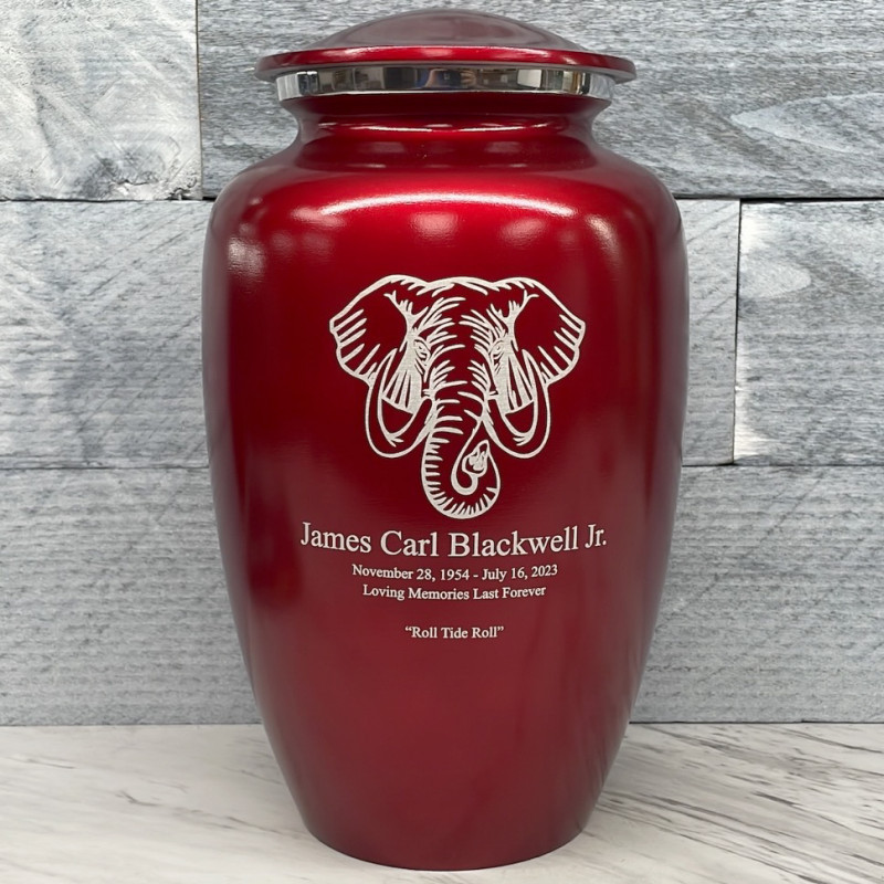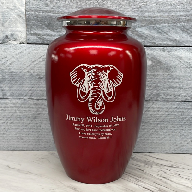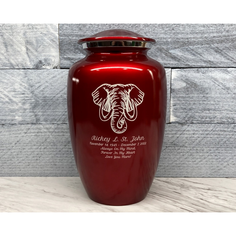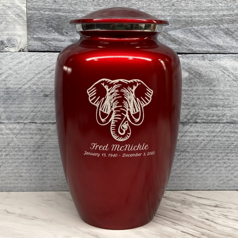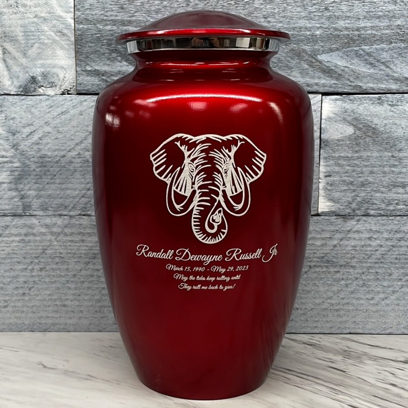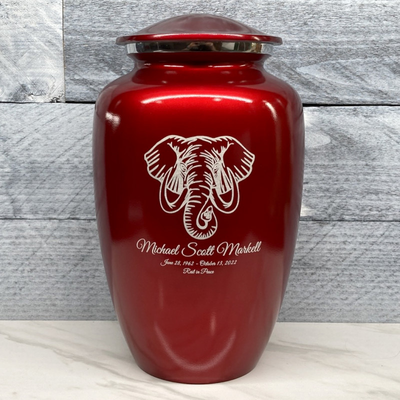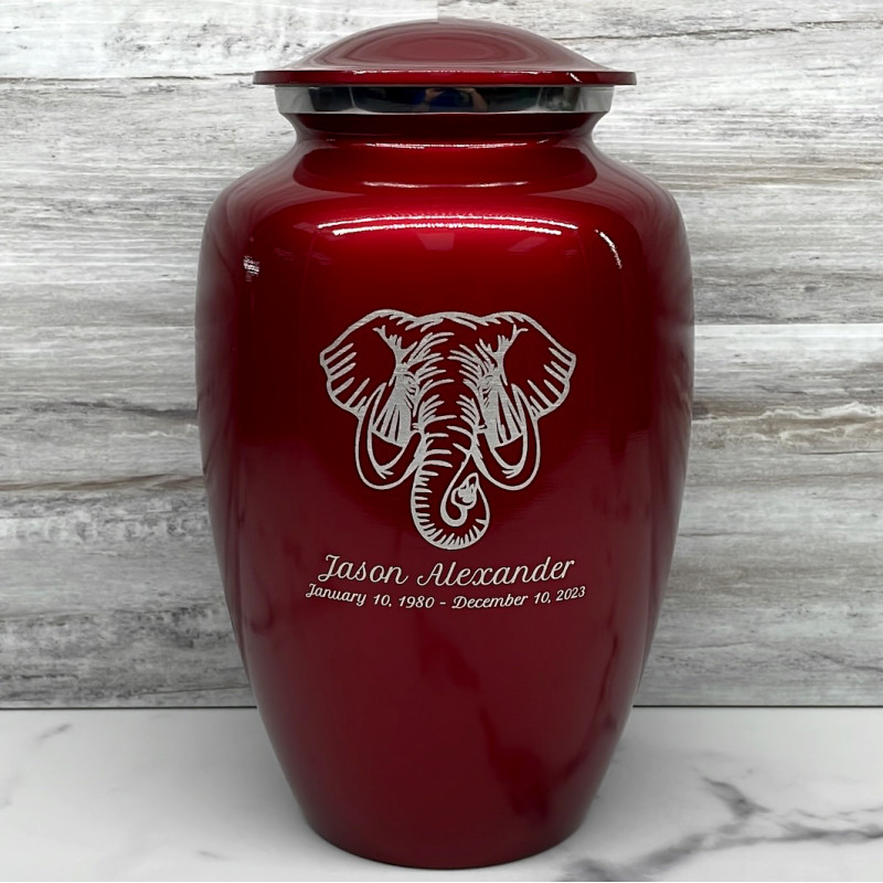 The Ruby Red Elephant Cremation Urn combines elephant artwork with an attractive deep red finish to create an beautiful memorial for your loved one. Add optional engraving and use the guided wizard to input the name, dates and additional sentiment on the front of the urn. During this process you will have the option of adding even more engraving to the back of the urn as well.