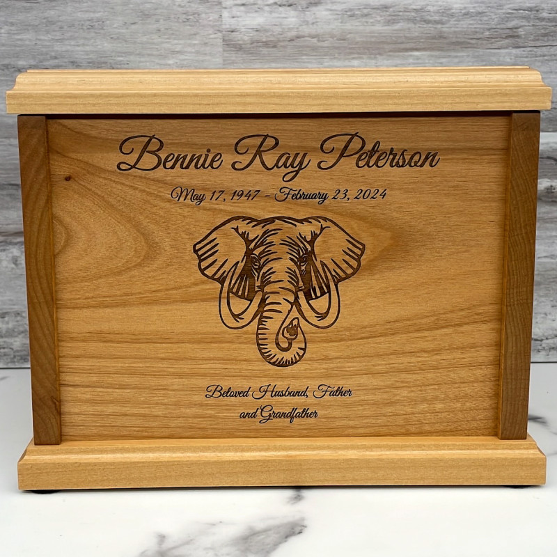 Fine detailing in the grain gives contrast to the elephant artwork that is engraved into the wood. To completely personalize your memorial, names, dates, and sentiments can be added to either the front or back of your urn.
