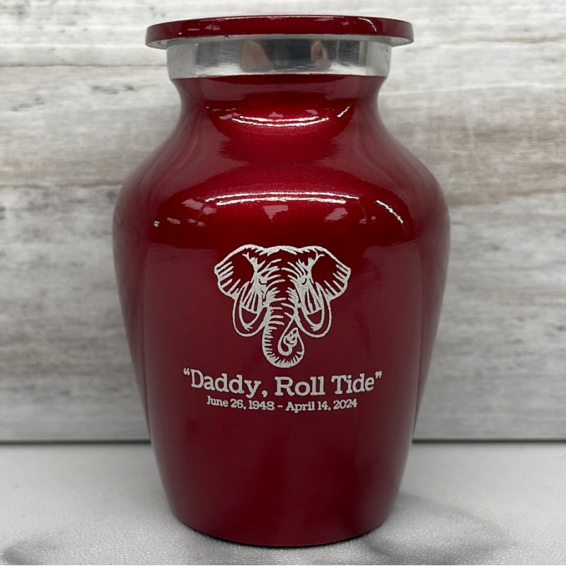 This keepsake cremation urn matches our full size Ruby Red Urn in color and finish and makes it easy and inexpensive to ensure everyone in your family can keep their loved one close.