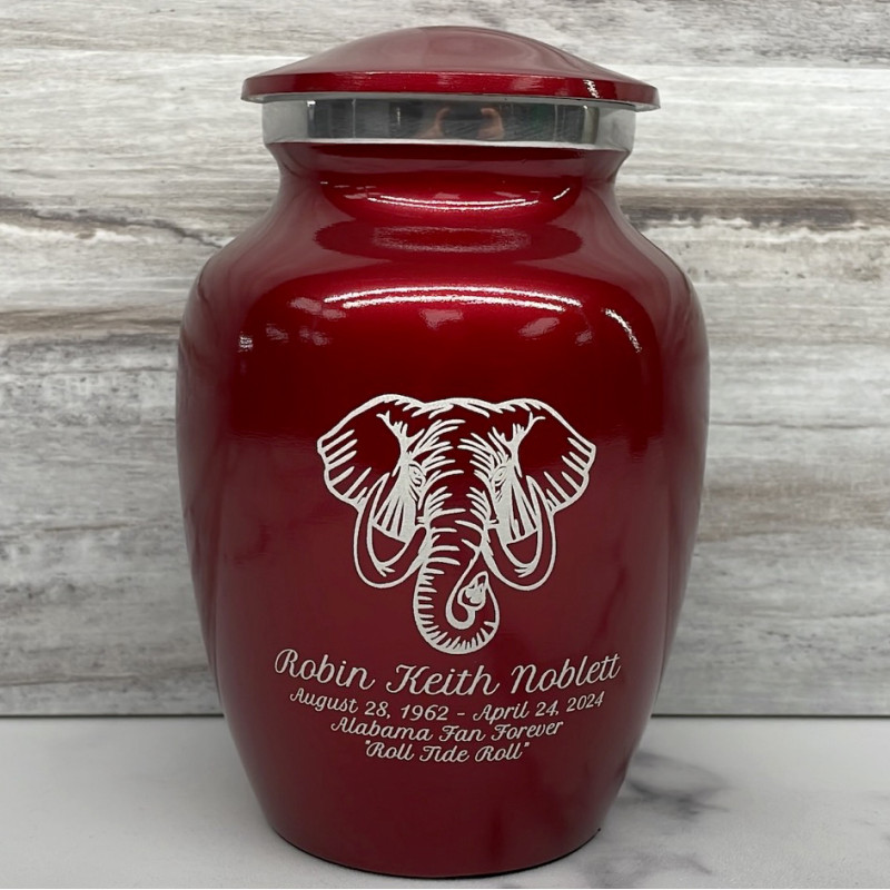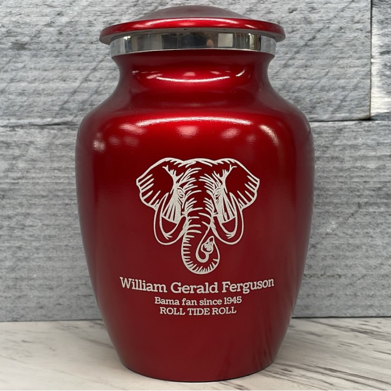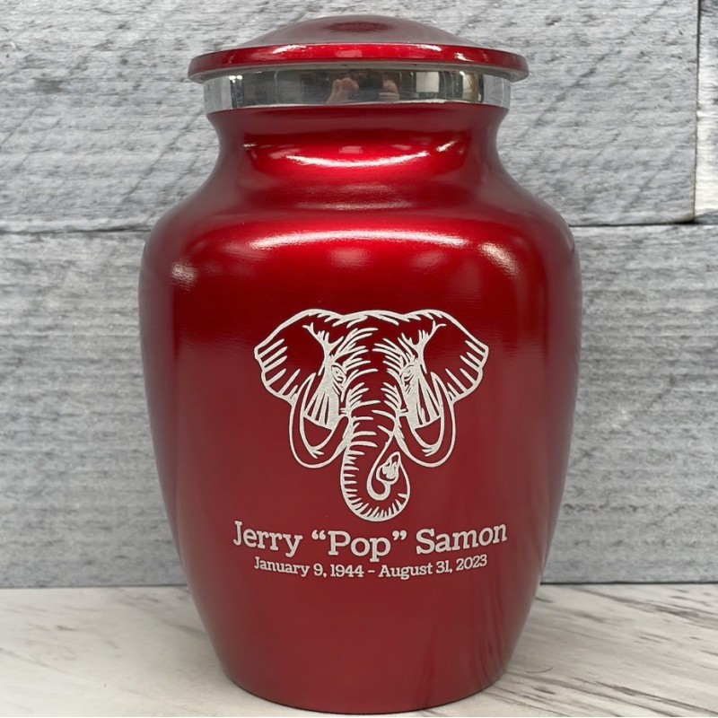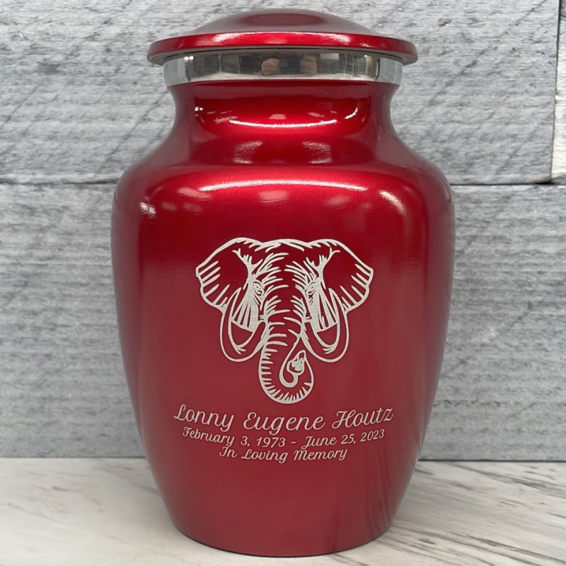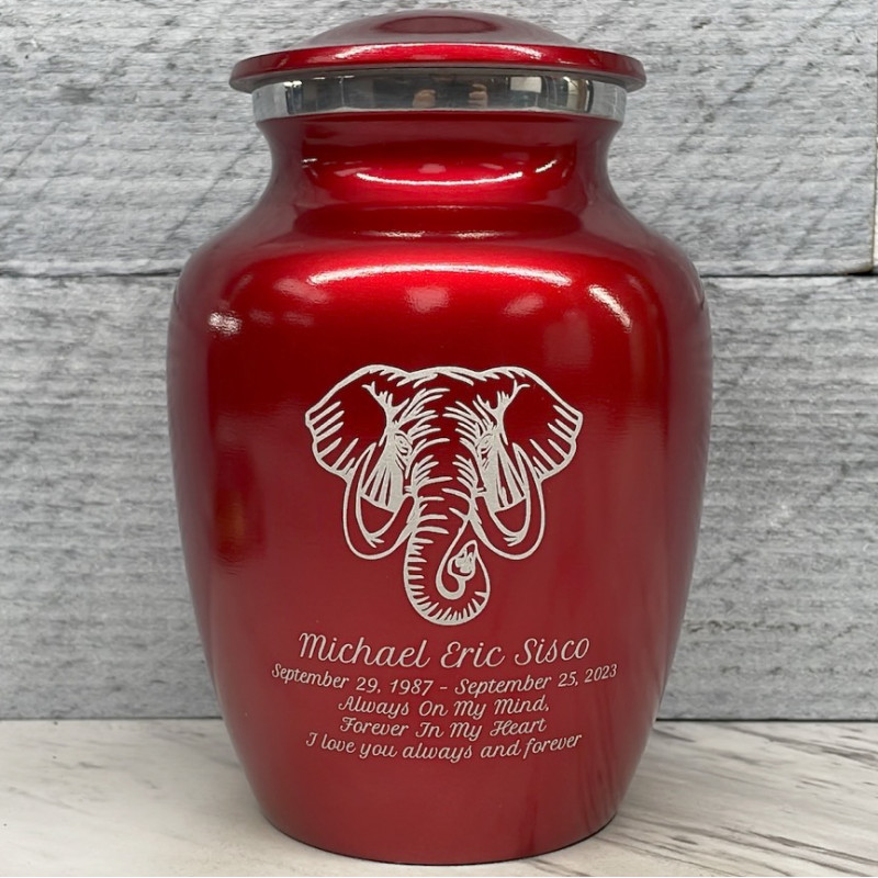 The Ruby Red Elephant Sharing Cremation urn features a powerful, wise and incredibly detailed elephant. It's an outstanding value that allows everyone in the family to have a memorial of their own. Optional engraving front and back there are many ways to make the urn unique to your loved one. A threaded lid and felt base ensure it securely closes and protects display surfaces.