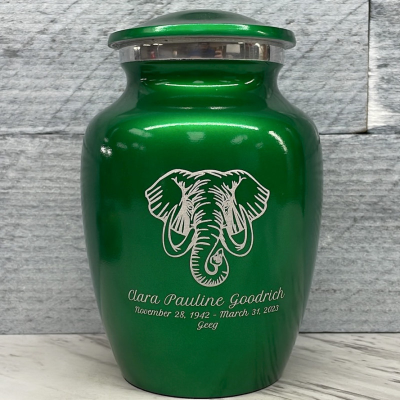 The Shamrock Green Elephant Sharing Cremation urn features a powerful, wise and incredibly detailed elephant. It's an outstanding value that allows everyone in the family to have a memorial of their own. Optional engraving front and back there are many ways to make the urn unique to your loved one. A threaded lid and felt base ensure it securely closes and protects display surfaces.