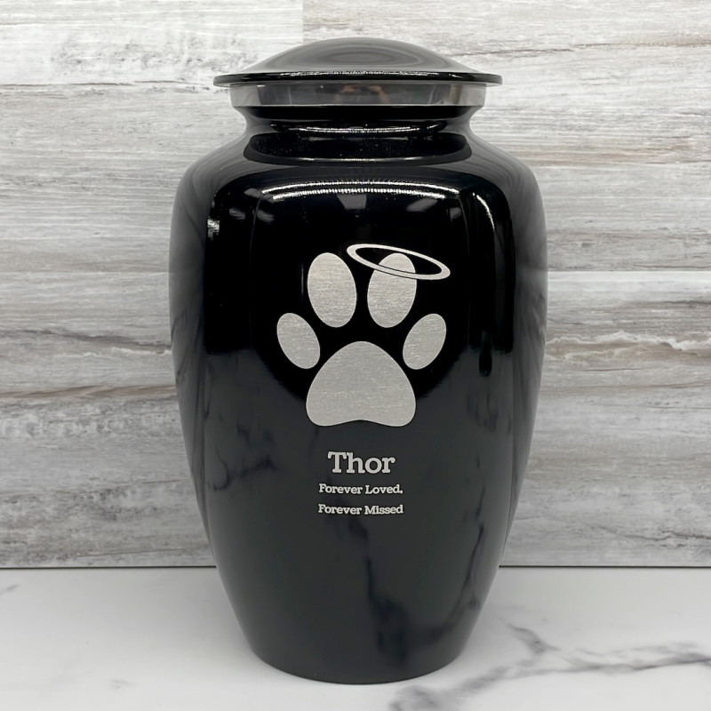 The Extra Large Jet Black Angel Paw Cremation Urn Pet Cremation Urn is an attractive and meaningful way to pay tribute to your pet who has passed on. Optional engraving features a name line and two additional lines that can include dates or sentiment lines. Choose from our most popular sentiments, customize them or enter your own text to make it completely unique.