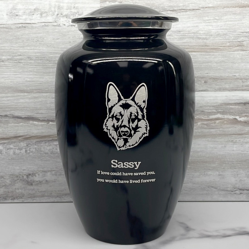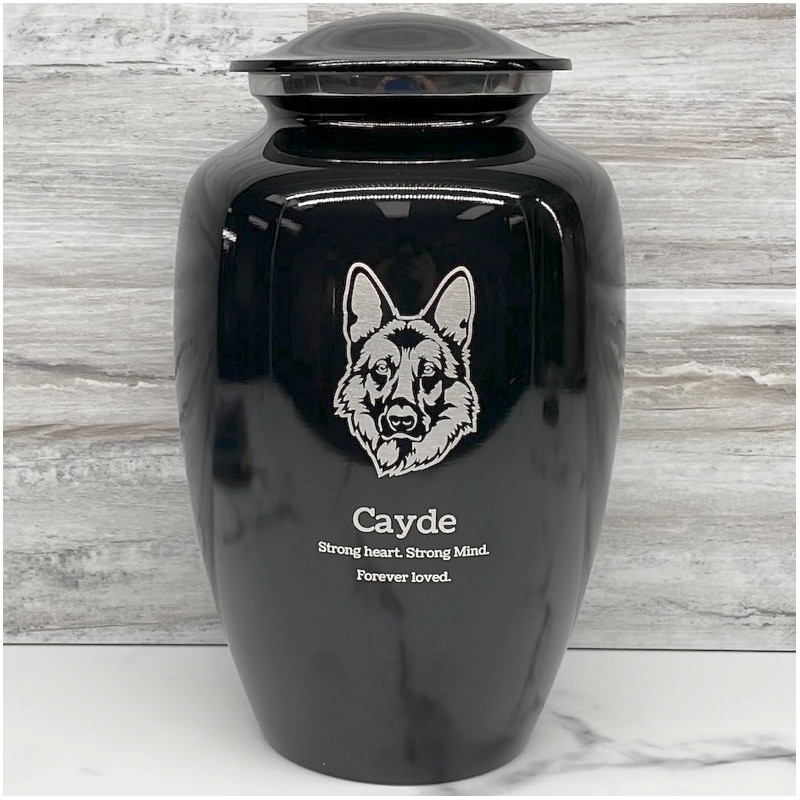The Extra Large Jet Black German Shepherd Cremation Urn Pet Cremation Urn is an attractive and meaningful way to pay tribute to your pet who has passed on. Optional engraving features a name line and two additional lines that can include dates or sentiment lines. Choose from our most popular sentiments, customize them or enter your own text to make it completely unique.