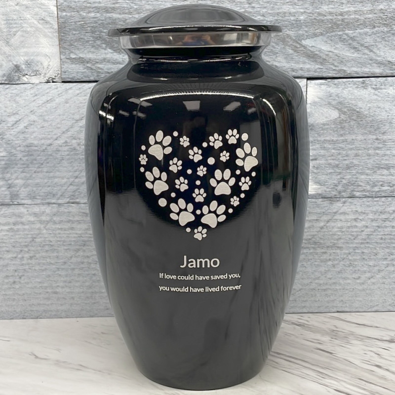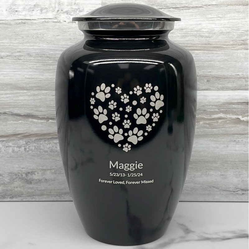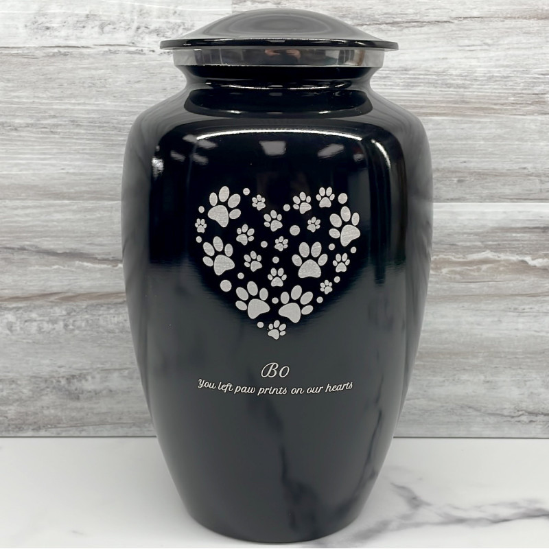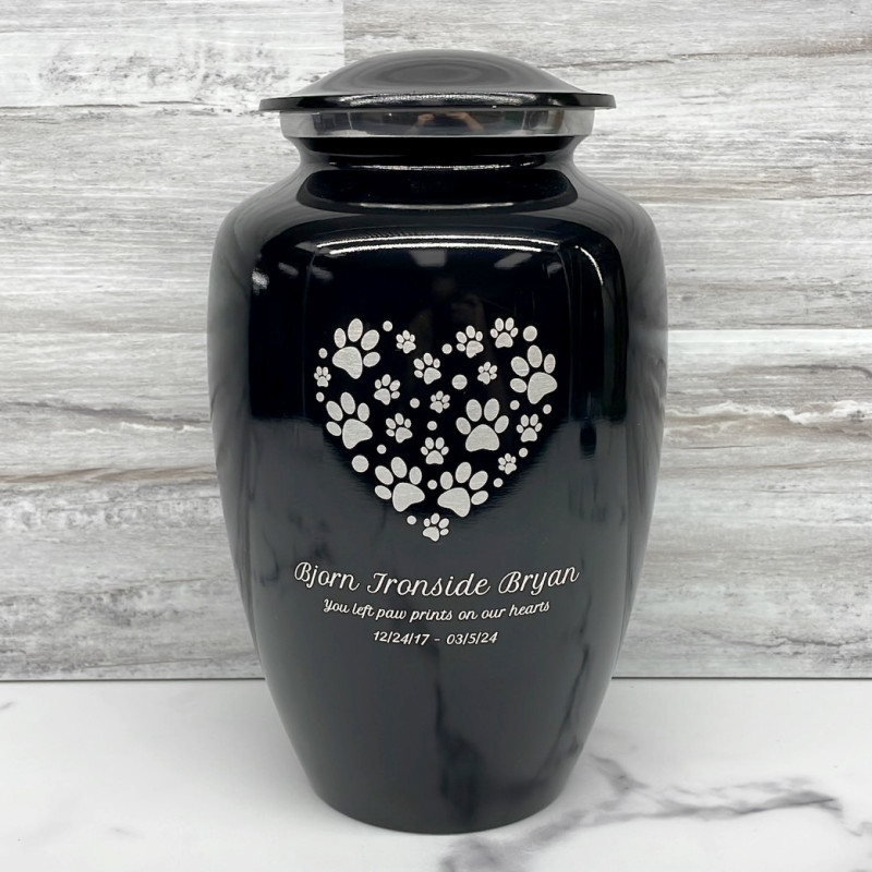Extra Large Pawprint Heart Pet Cremation Urn - Jet Black