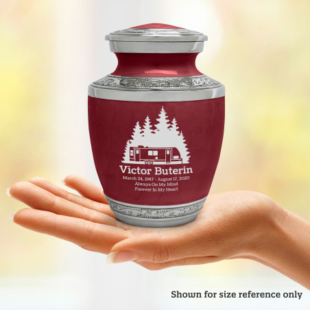 Select Fifth Wheel Camper Sharing Urn - Rose Red to create a personal memorial that is a step larger than a keepsake urn but more petite than a full size urn. Bold, attractive colors offer sharp contrast with the engraved text and detailed artwork.