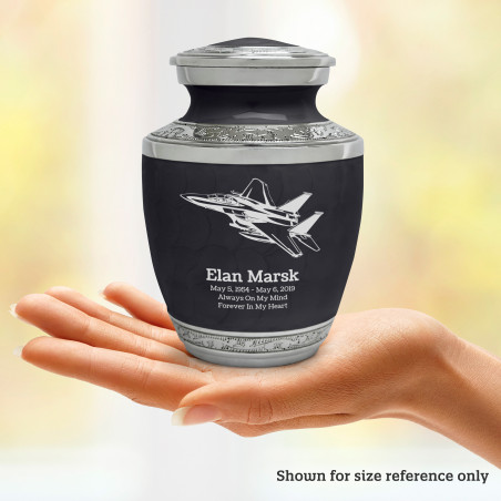 Select Fighter Jet Plane Sharing Urn - Ebony Black to create a personal memorial that is a step larger than a keepsake urn but more petite than a full size urn. Bold, attractive colors offer sharp contrast with the engraved text and detailed artwork.
