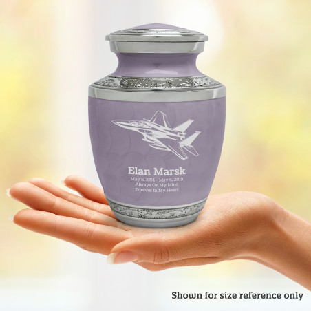 Select Fighter Jet Plane Sharing Urn - Regal Purple to create a personal memorial that is a step larger than a keepsake urn but more petite than a full size urn. Bold, attractive colors offer sharp contrast with the engraved text and detailed artwork.
