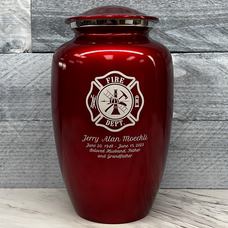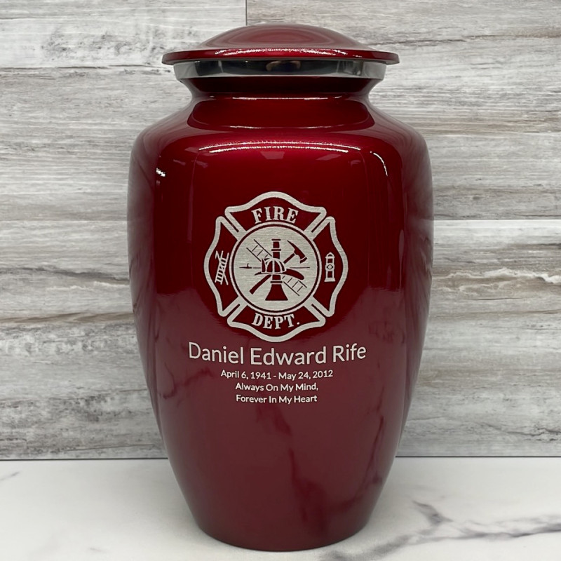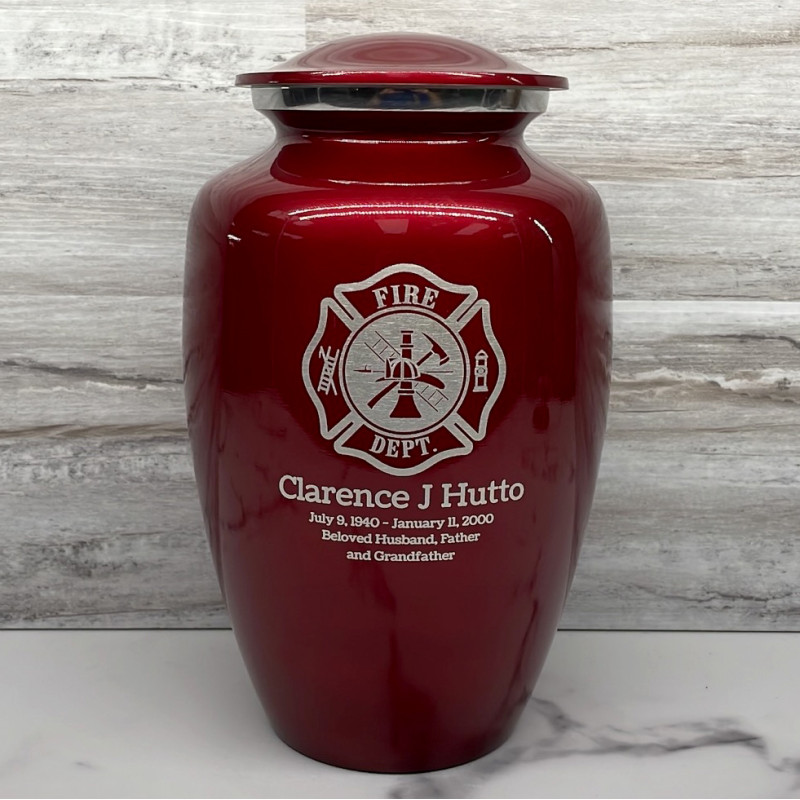 Choose the Ruby Red Firefighter Cremation Urn to celebrate your hero with a handsome, Fire Engine Red memorial engraved powerful fireman artwork. Customize the urn with special, optional engraving front and back. Using the guided personalization process, it is possible to choose from suggested sentiments or poems or create your own.