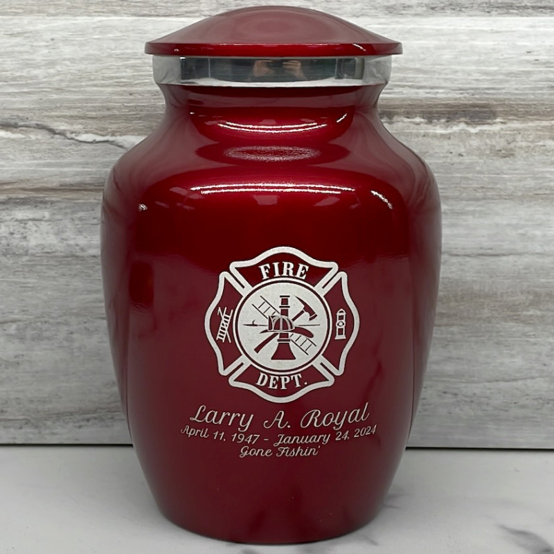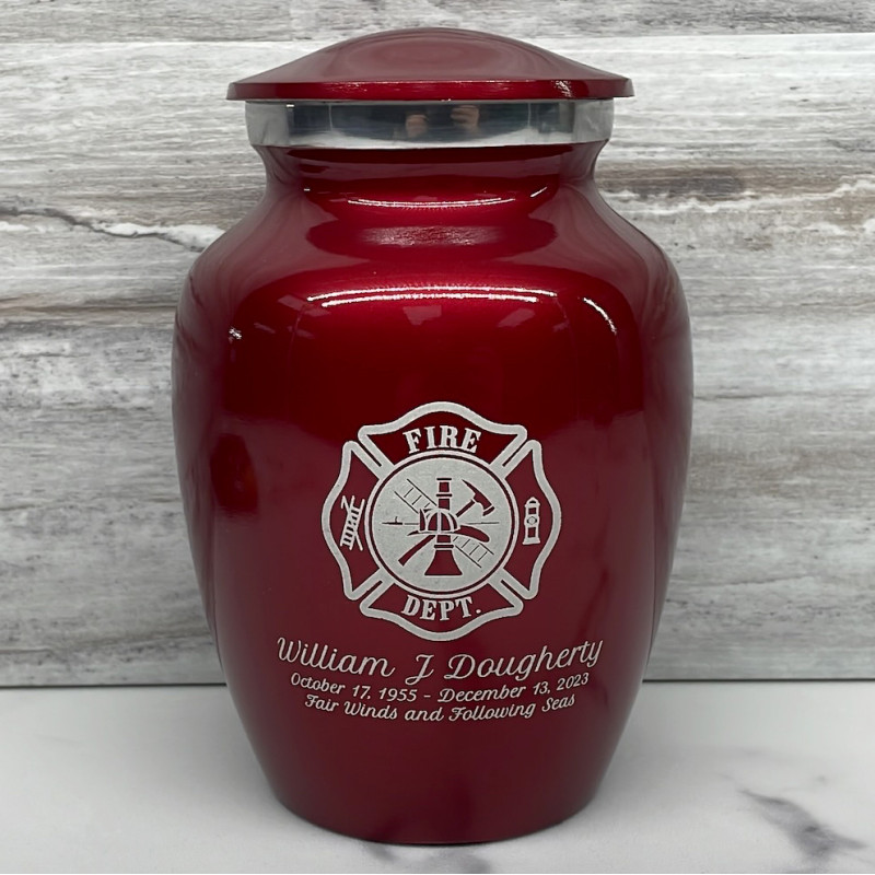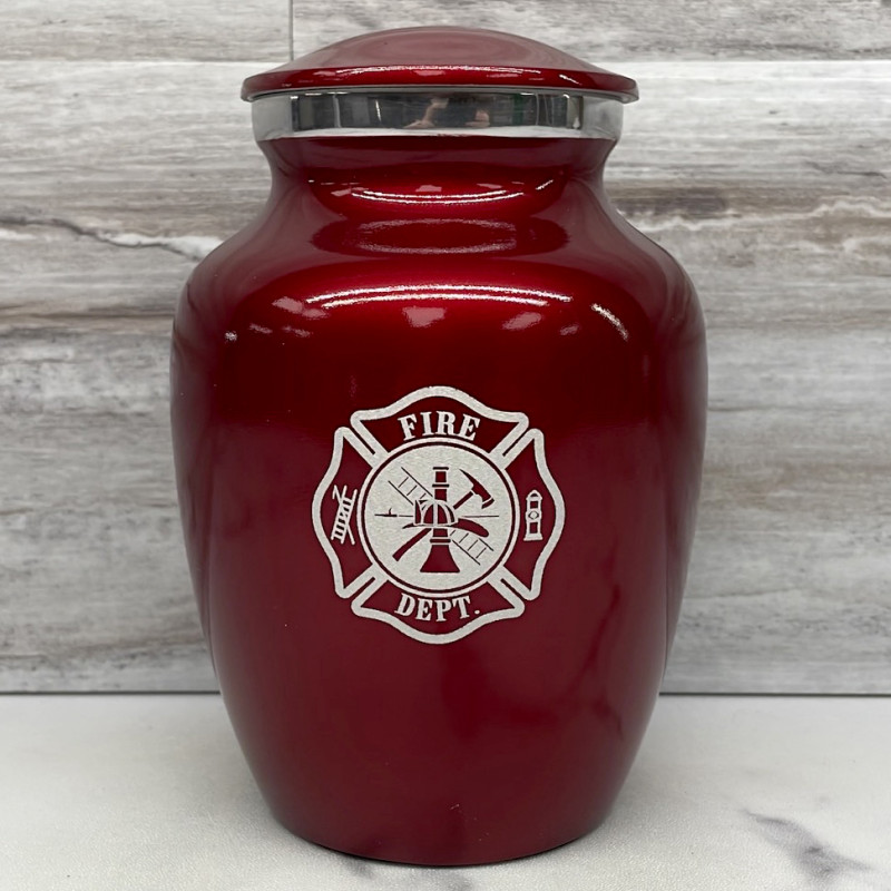 Remember your brave life saver with the Ruby Red Firefighter Sharing Cremation urn. It's an outstanding value that allows everyone in the family to have a memorial of their own. Optional engraving front and back there are many ways to make the urn unique to your loved one. A threaded lid and felt base ensure it securely closes and protects display surfaces.