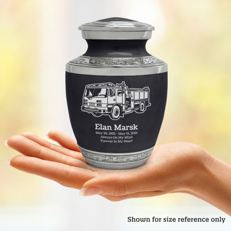 Select Firetruck Sharing Urn - Ebony Black to create a personal memorial that is a step larger than a keepsake urn but more petite than a full size urn. Bold, attractive colors offer sharp contrast with the engraved text and detailed artwork.