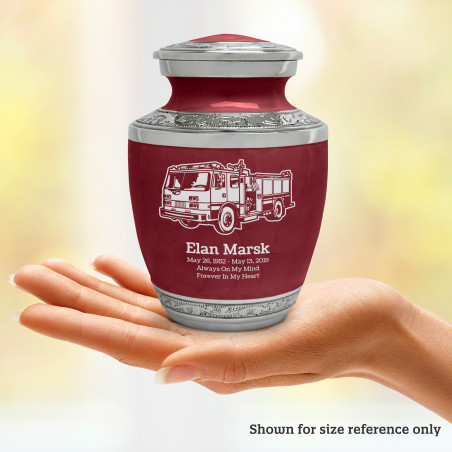 Select Firetruck Sharing Urn - Rose Red to create a personal memorial that is a step larger than a keepsake urn but more petite than a full size urn. Bold, attractive colors offer sharp contrast with the engraved text and detailed artwork.